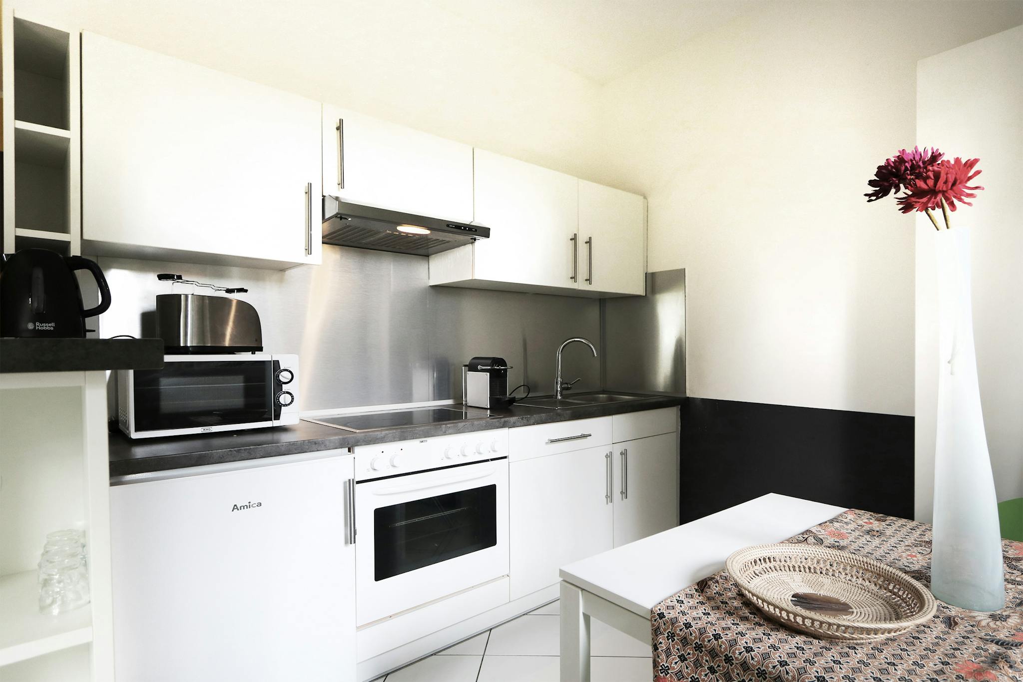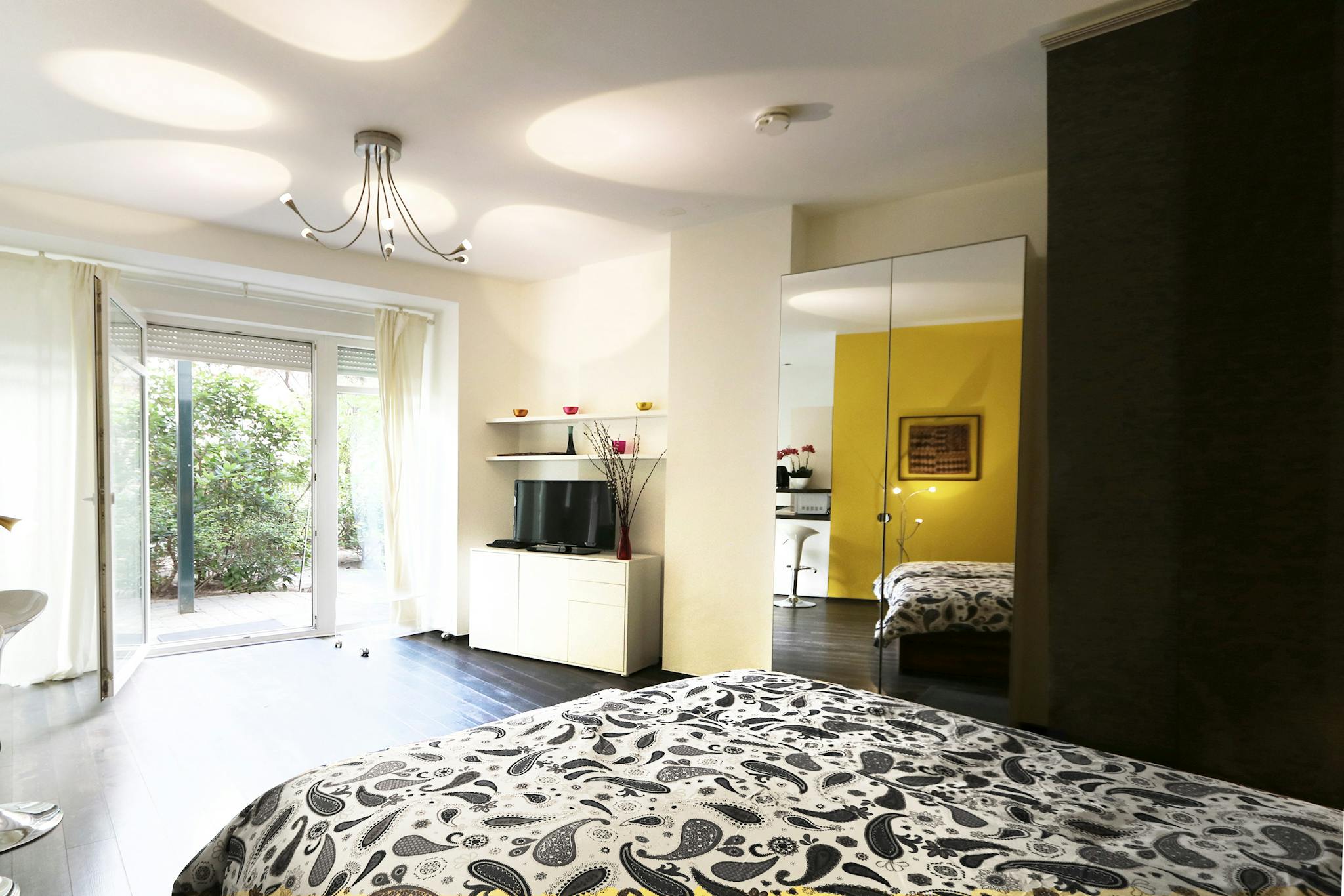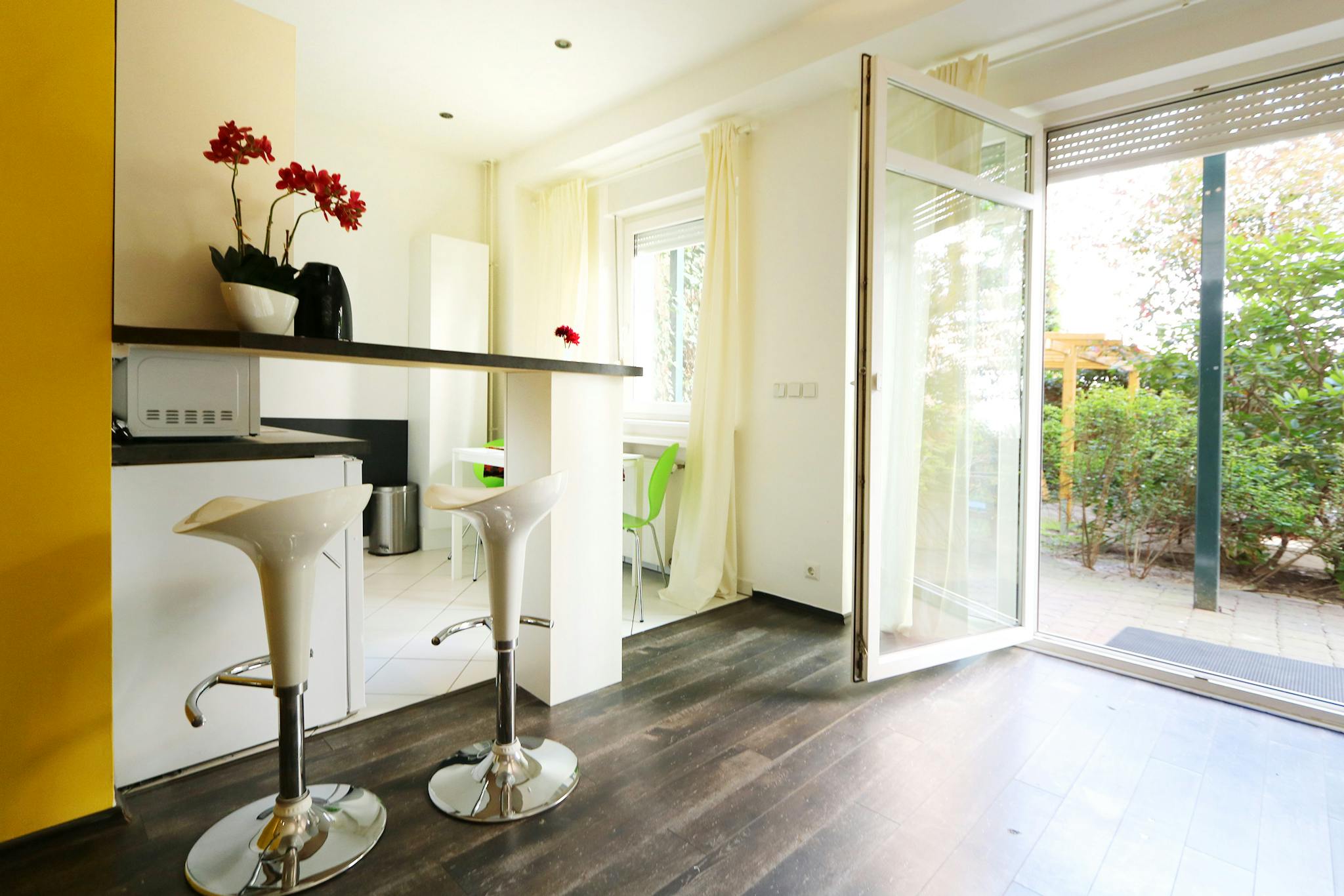 Non-SmokingNot allowedThis charming, newly renovated apartment is sited towards the lush courtyard of a lovely renovated traditional building. It is located on the ground floor and has a comfortable terrace. The studio apartment is lovely decorated, has a queen size bed, flatscreen TV, a built in cabinet and has an open plan kitchen with a bar plus an additional breakfast table. The large marble bathroom has a tub, washing machine and dryer. Naturally WIFI internet is provided too. There is an elegant entrance to the building and a basement for luggage storage.