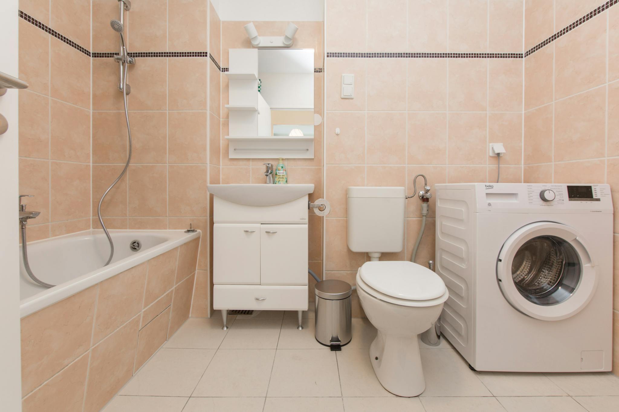 Shared areas include a washing machine, kitchen equipment, and all daily essentials.