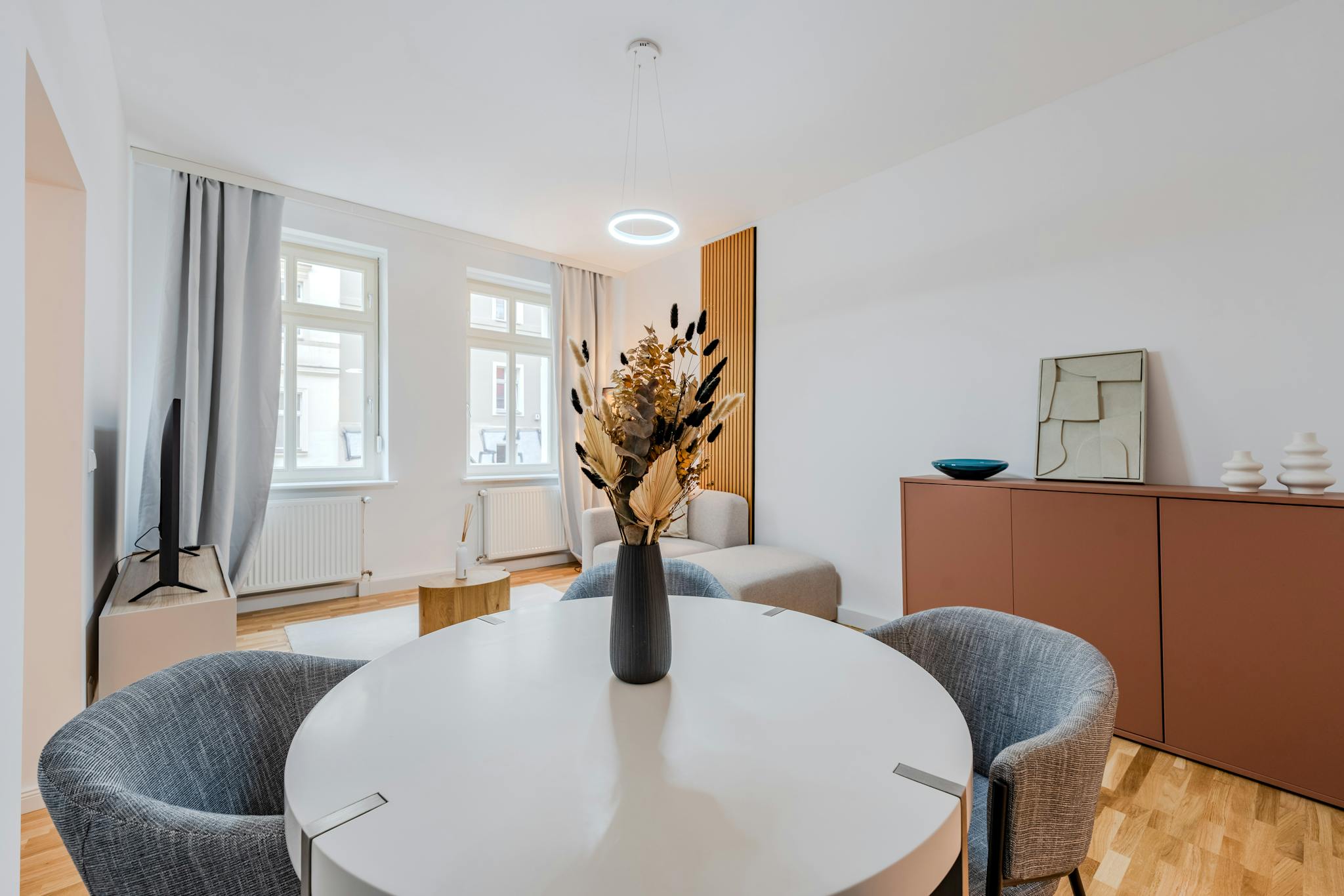This beautifully renovated and stylishly furnished apartment (Autumn 2025) offers everything you need for comfortable living. The bright living room features a cozy sofa that invites you to relax and a large smart TV to stream your favorite shows. A dining table seats four, perfect for meals or hosting friends.
