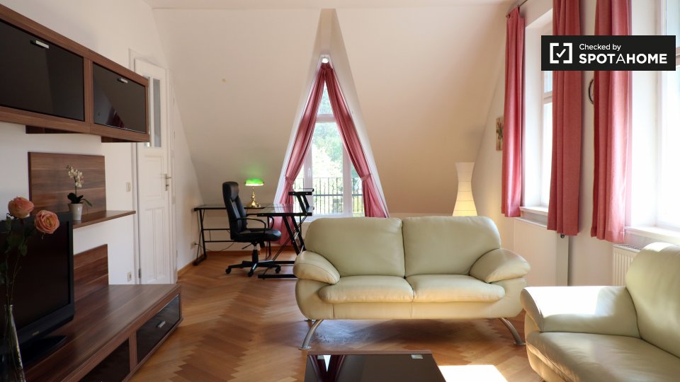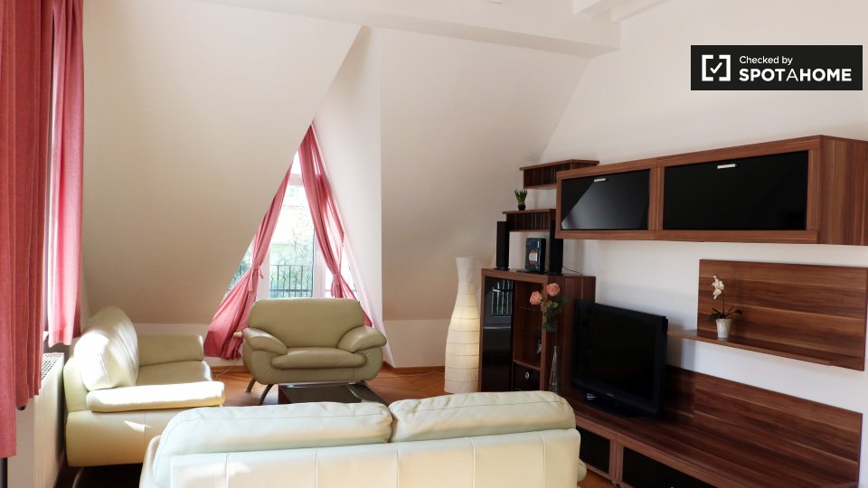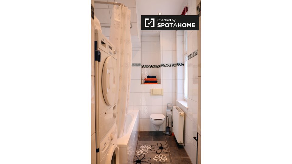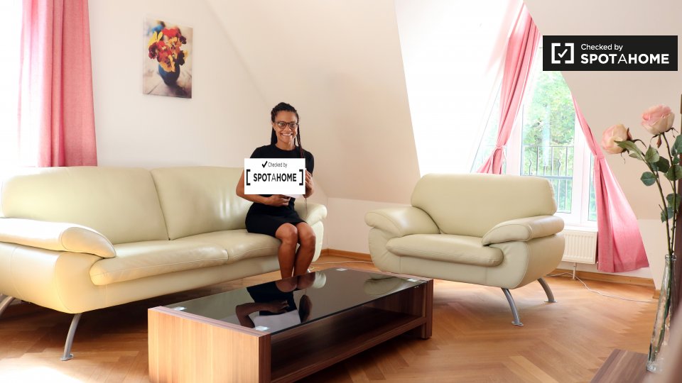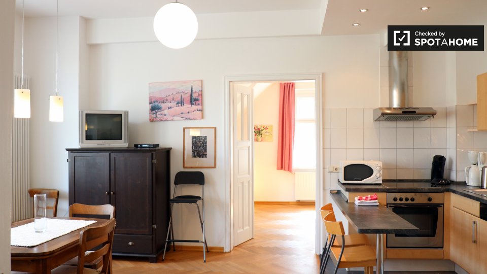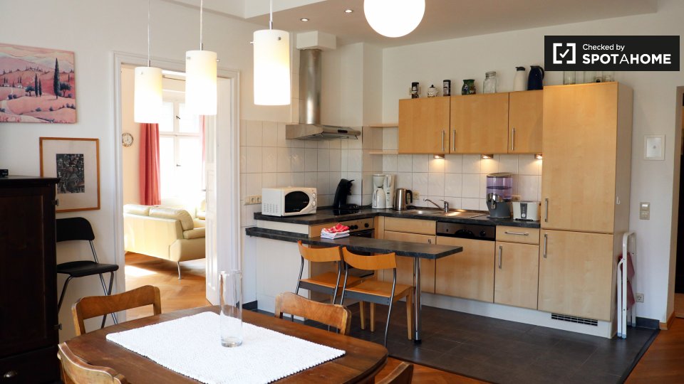 This apartment is southwest of the city center. It's also in a calmer, more residential area – if you need to get work done from home, there won't be too much distracting noise. There is an ALDI supermarket a 20-minute walk away.