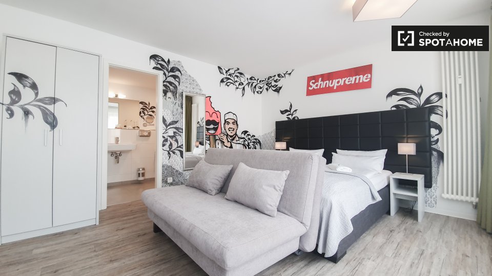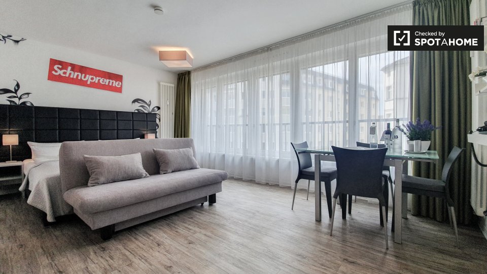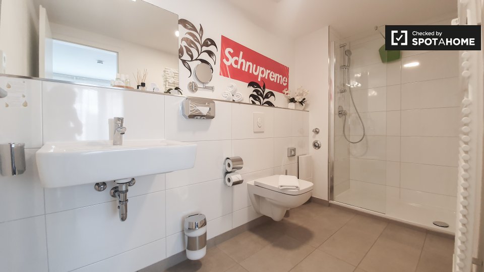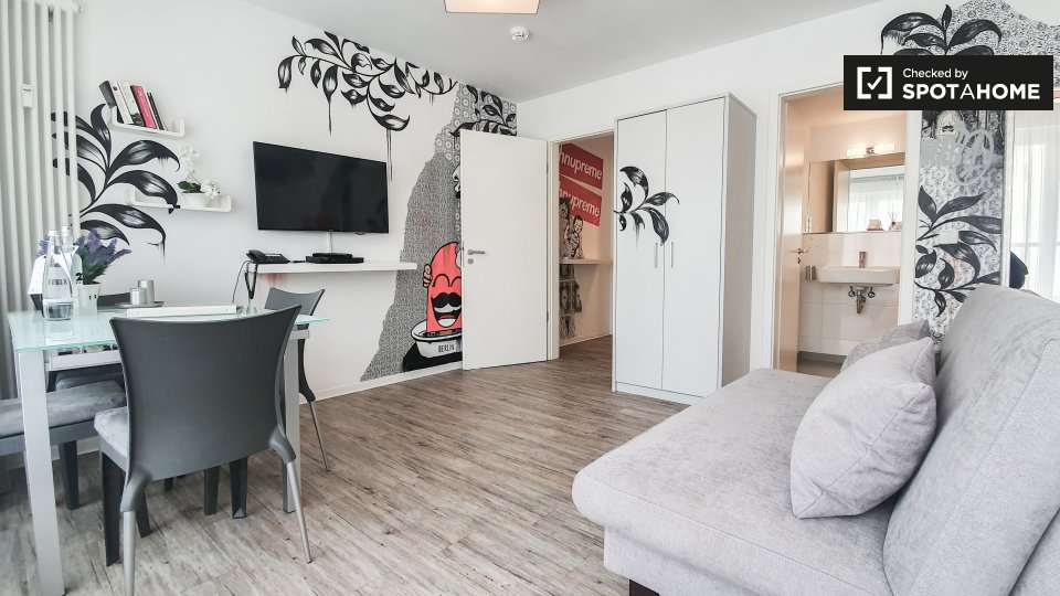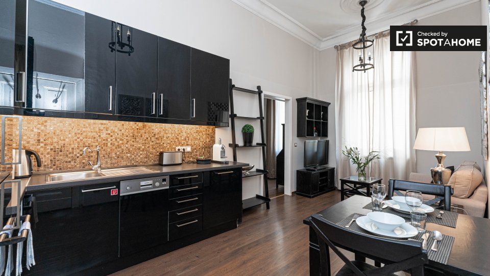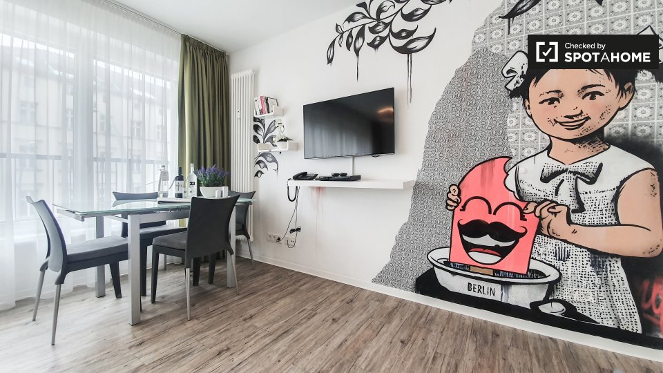 Pets allowedAllowedThis stylish 1-bedroom apartment in Scheunenviertel offers a fully furnished space with central heating. The apartment has an equipped kitchen featuring a dishwasher, oven, and common washing and drying facilities. Pets are allowed, and bills covering electricity, water, gas, and WiFi are included. The property has been personally checked by Spotahome, ensuring quality and reliability. Smoking is not permitted within the apartment.