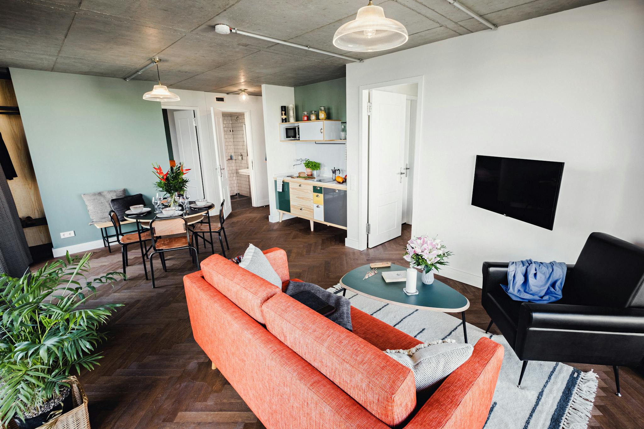 Space to unwind. This is our largest category, with a size of 64 square meters. Here you will find 2 bedrooms, 2 bathrooms and a spacious living and dining area. Whether for you and your family or with guests, this apartment offers you the best space. The balcony invites you to linger outdoors.