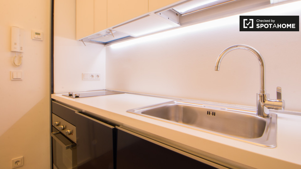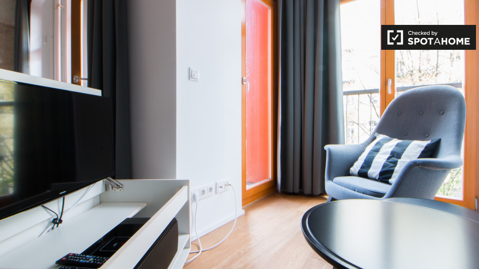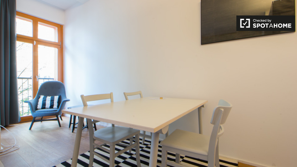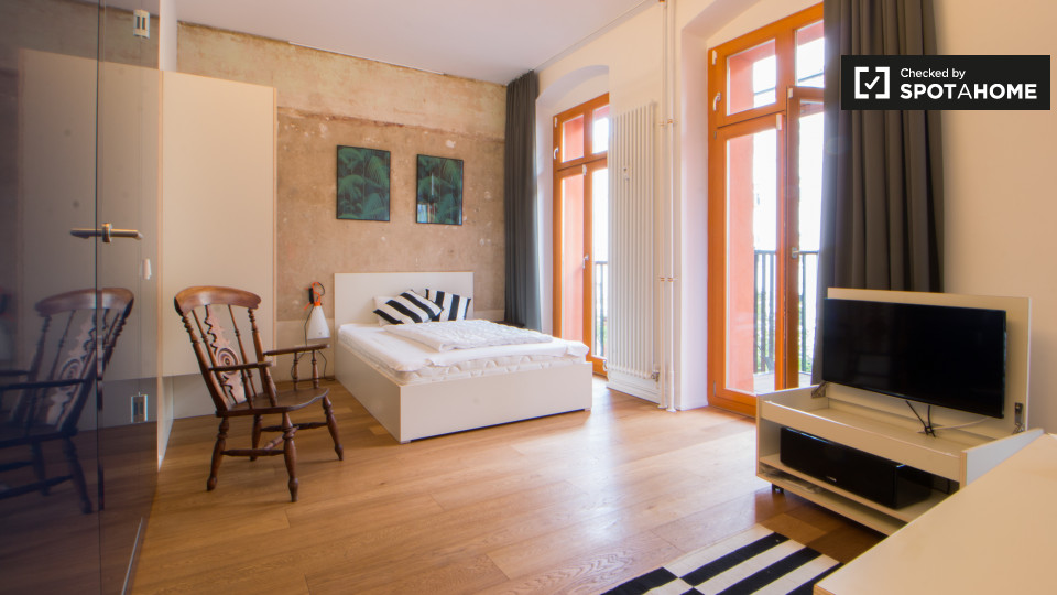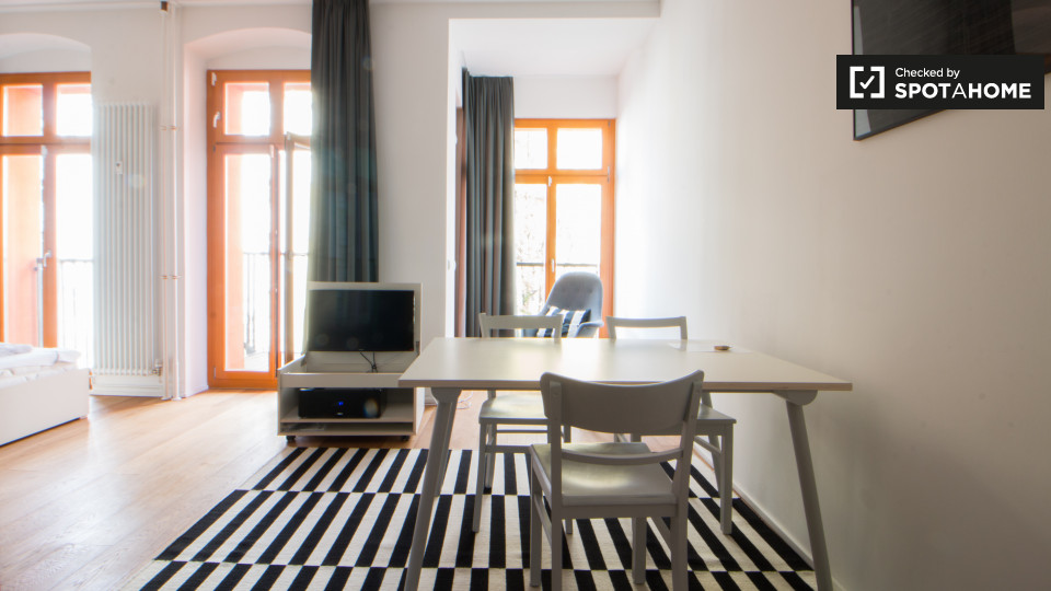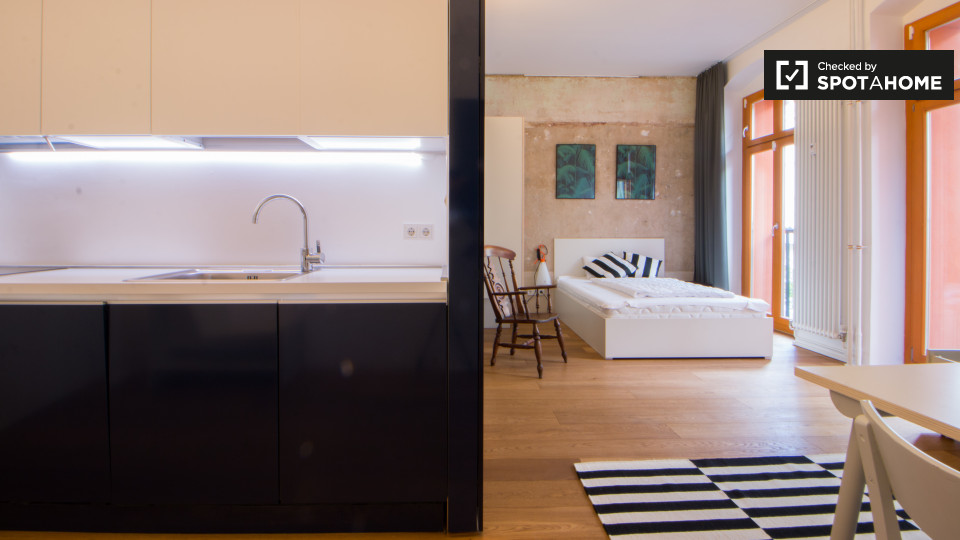 Pets not allowedNot allowedThis stylish 35 m² studio apartment available to rent in located in trendy Friedrichshain. The studio has a stylish blue theme and comes with modern decor as well as a beautiful black and white rug. There is a double bed, dining table, sitting area, and fully equipped kitchen corner.