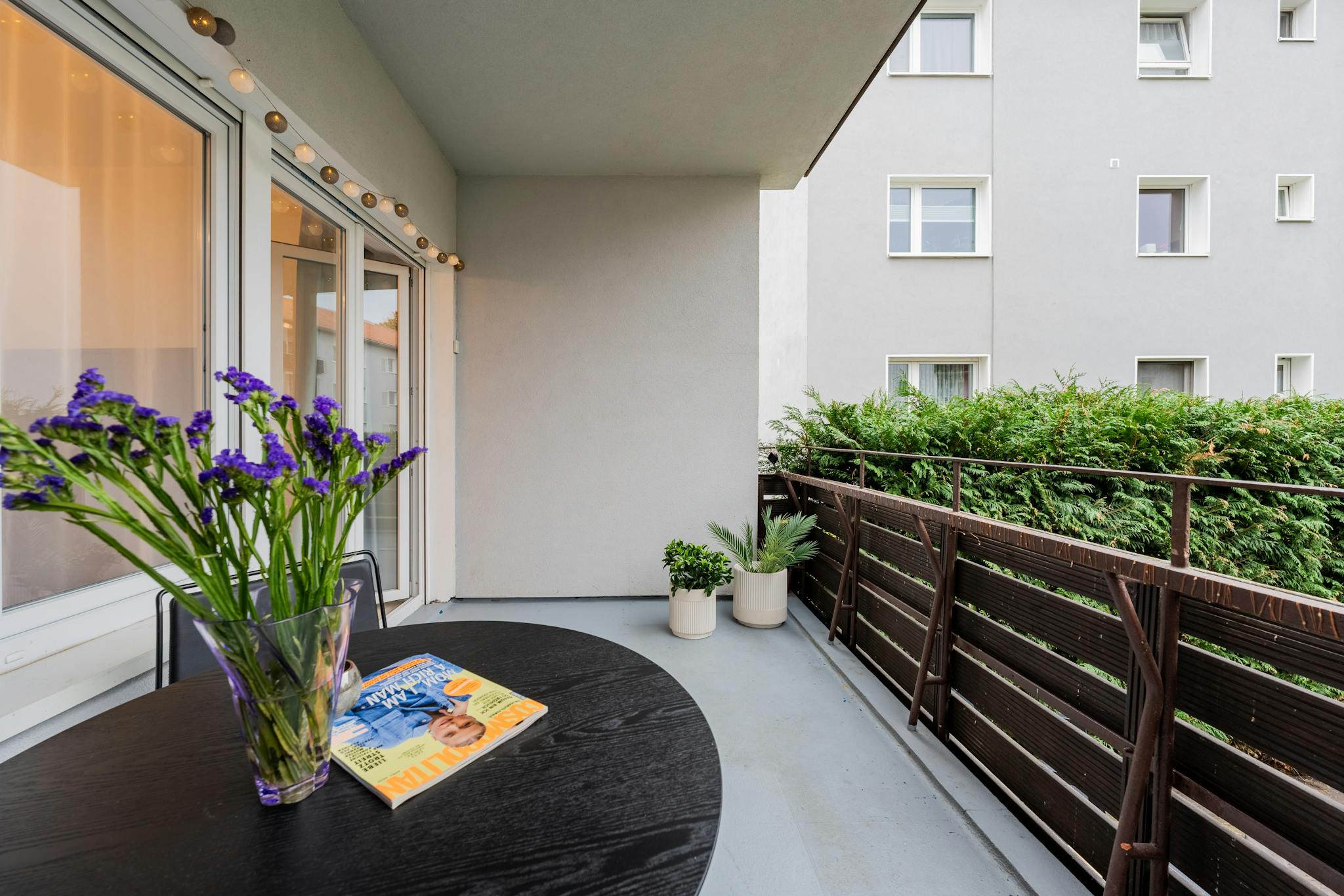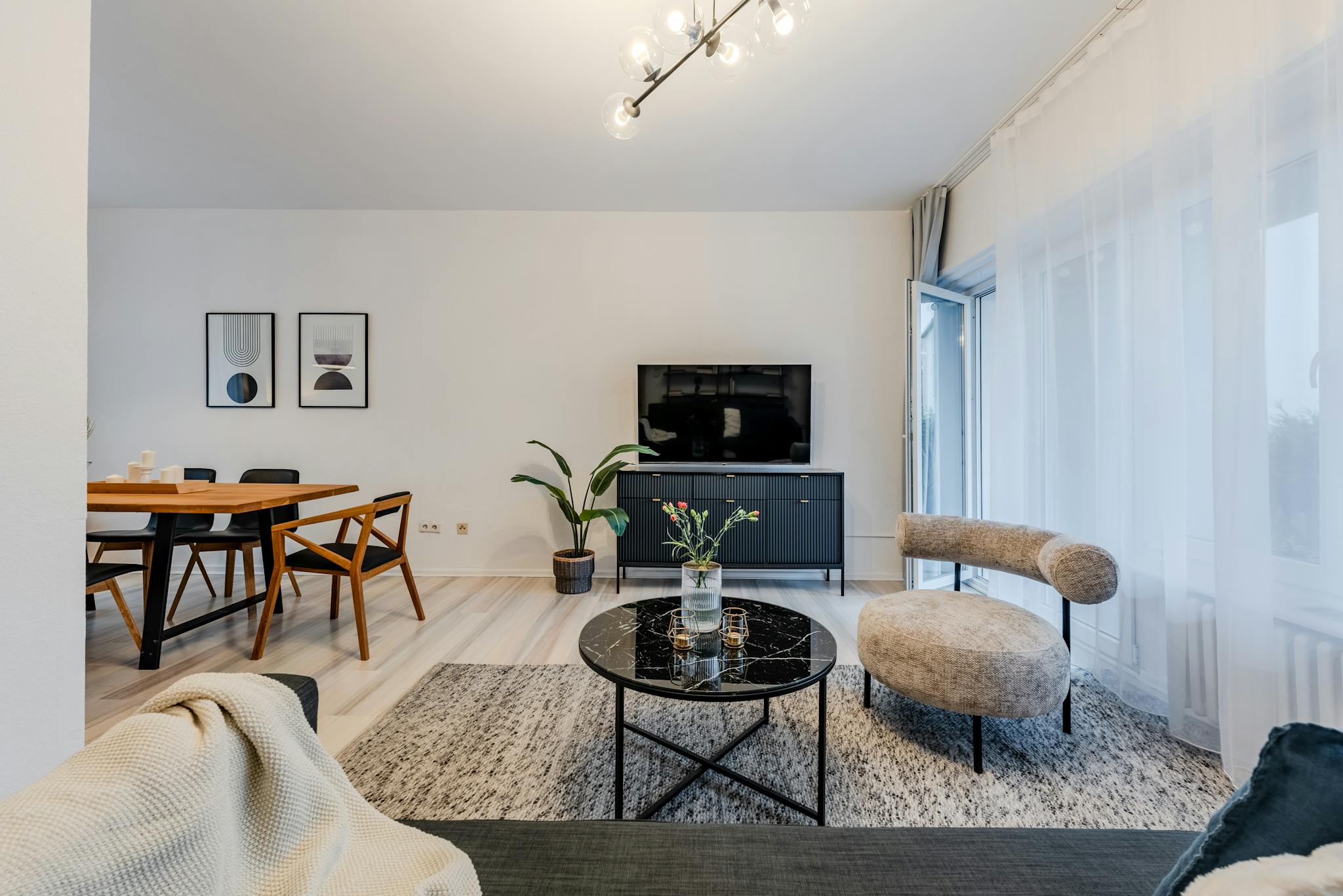 The expansive living room provides a versatile space for relaxation and entertainment, complete with a large convertible sofa, a modern 4K TV, and a dining area that accommodates up to six people. The living room opens onto a spacious balcony with access to a beautiful private garden, perfect for enjoying outdoor moments and fresh air.