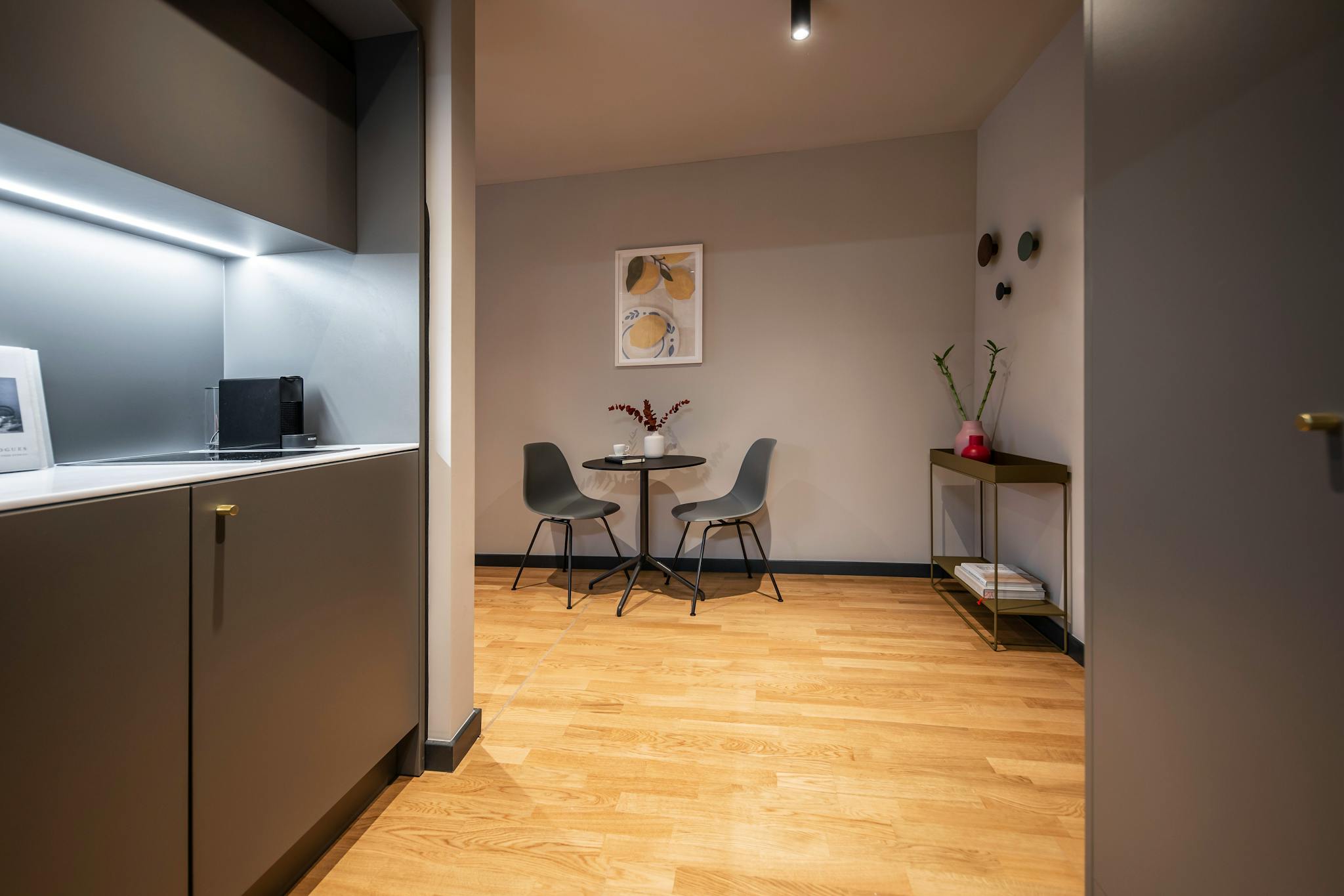 This cozy yet functional apartment is perfectly suited for solo travelers seeking comfort and style. Thoughtfully designed, the apartment features a custom-built designer kitchen, a comfortable 140 cm box-spring bed, and a dedicated workspace. Adding to its charm, this "Xtra Smart+" category apartment comes with a private balcony, creating a perfect blend of efficiency and relaxation.