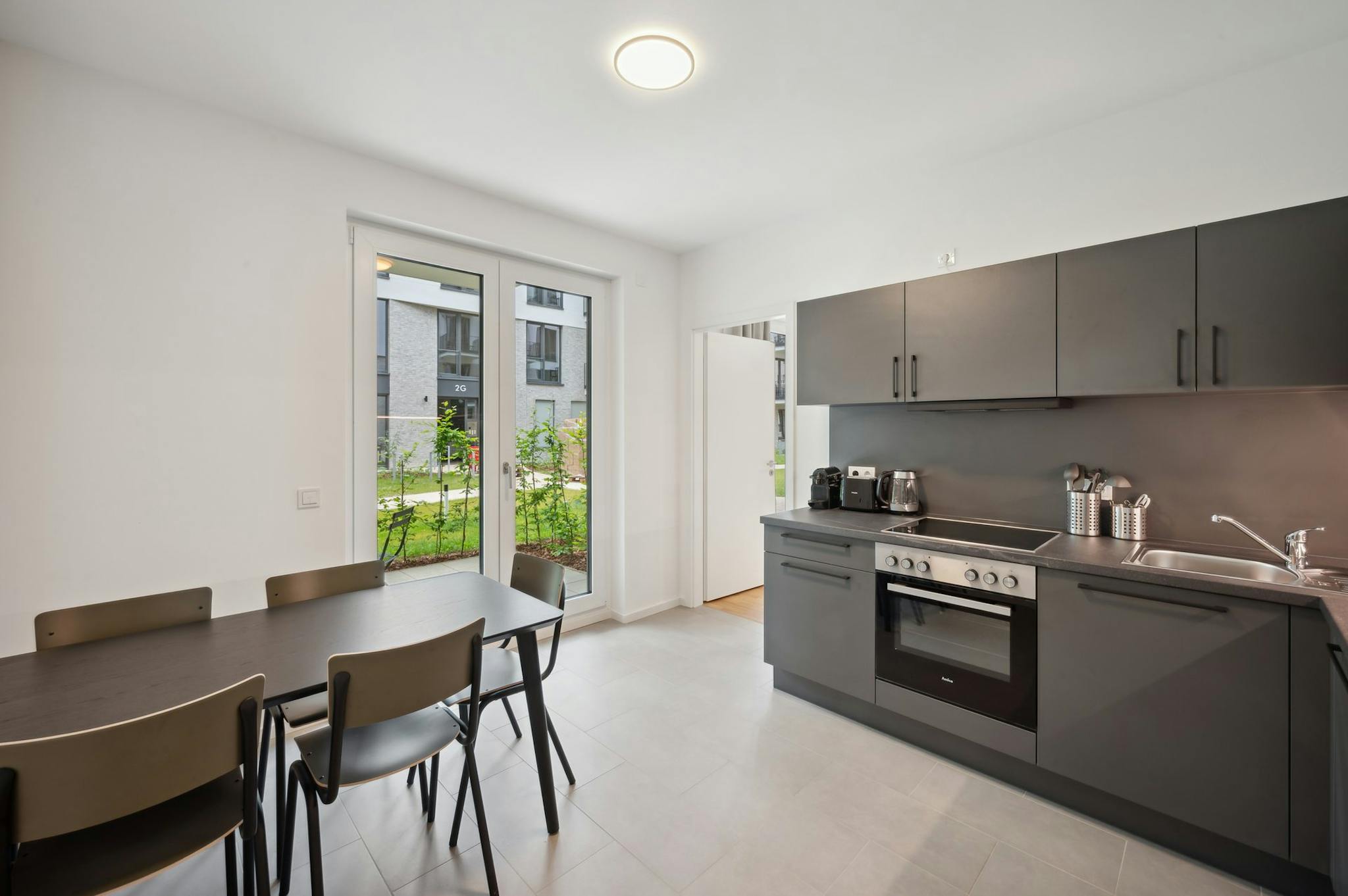 Our two newly built buildings surrounded by a green courtyard create a safe secluded space for you to find peace in the midst of Berlins city life. The property is purposefully built to be an ideal location for you to enjoy the co-living lifestyle, and be part of the (hidden) community. There are two community spaces - one in each of the buildings. Both of them feature fully equipped kitchens with cooking islands and lounge areas with sofas, armchairs, coffee tables, and a TV. You can spend time cooking meals together with your flatmates here or relax watching a new show. In alignment with our sustainability efforts, both buildings are illuminated with energy-efficient LED lights.