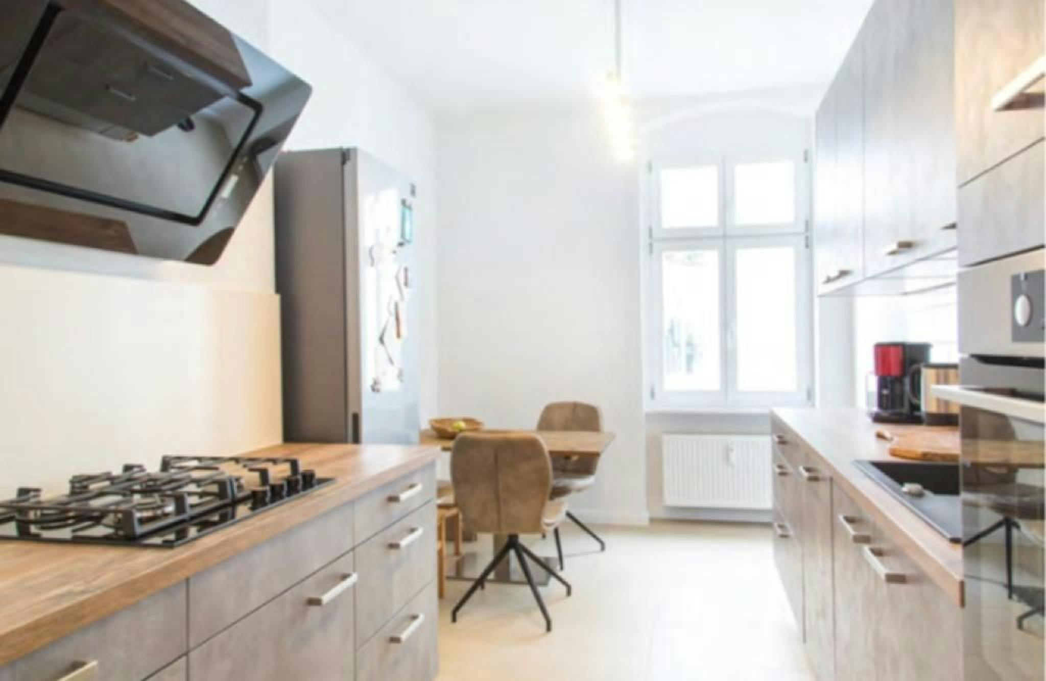 Die Wohnung verfügt über eine voll ausgestattete Küche in modernem Stil mit Gasherd, Kühlschrank, Tiefkühlfach und Geschirrspüler. In dem Schlafzimmer befindet sich ein hochwertiges Bett mit Überlänge. Durch die Vorhänge ist das Schlafzimmer nahezu Lichtdicht.