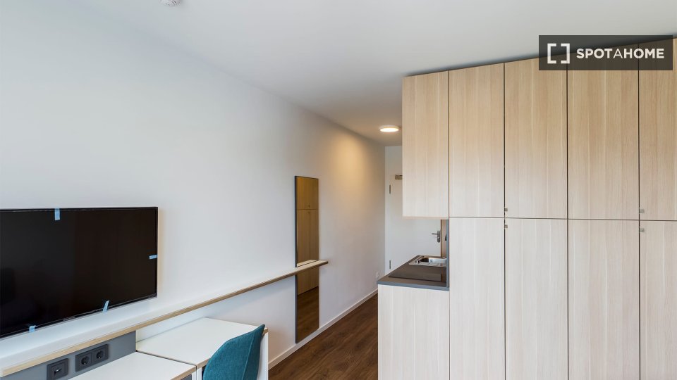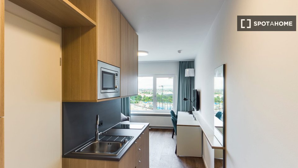 The studios are equipped to a high standard: from a timeless kitchenette with stove, refrigerator, and built-in microwave to modern bathrooms with spacious walk-in showers.