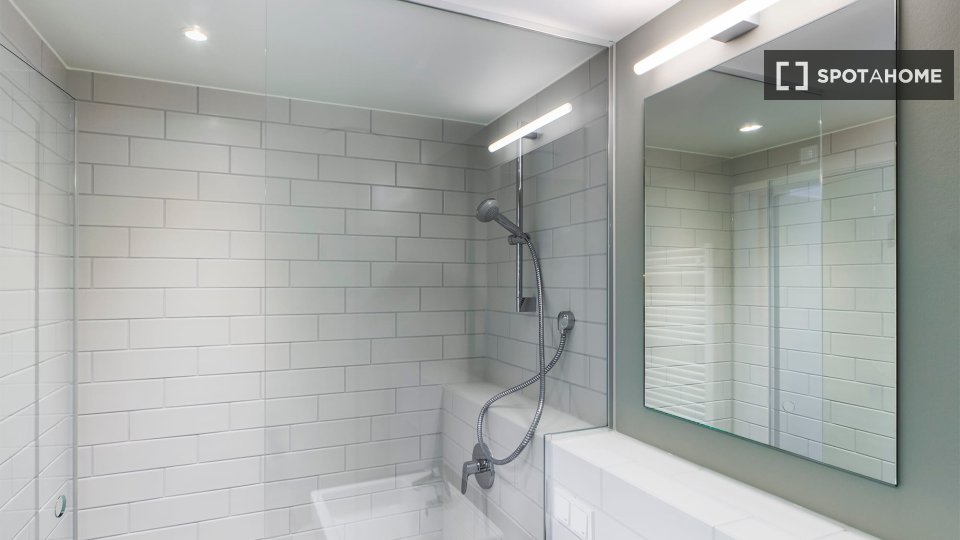 Shower, Mirror, Sofa Bed, Wardrobe, Fitted kitchen, Refrigerator, Microwave, Dishwasher, Coffee Table, TV, Working desk, Lamp, Chairs