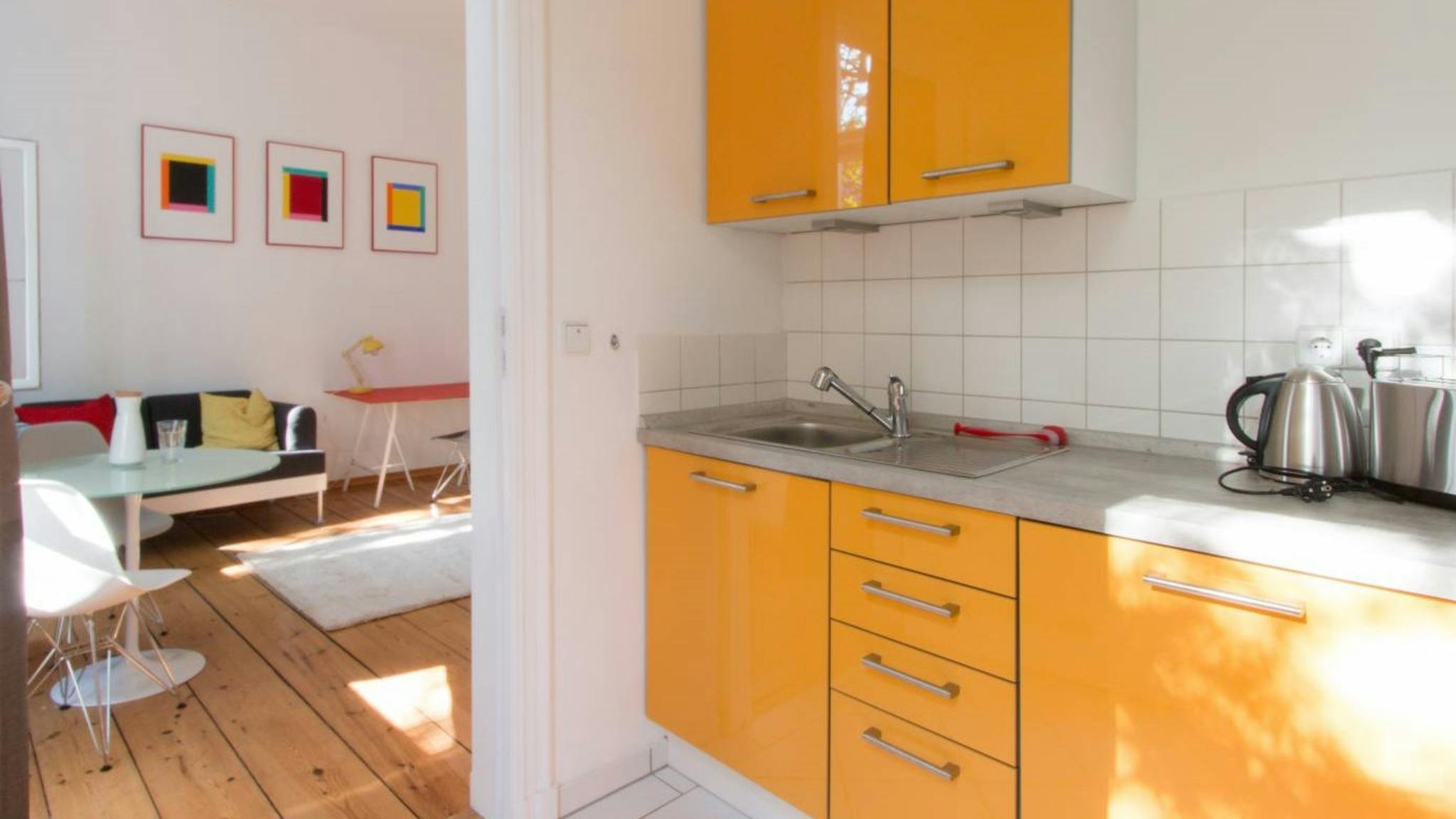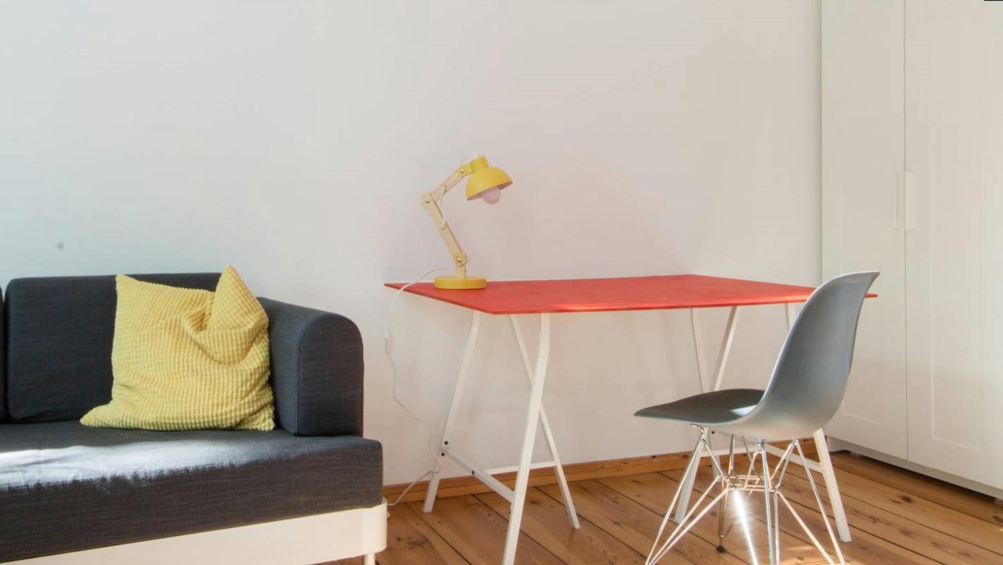 A stylish studio apartment is available to rent in Tiergarten. The apartment has a spacious main room with beautiful wood floors, where you'll find a large double bed, a cozy sofa, a TV, a small dining table, and lots of storage space for all your things in the huge standalone wardrobe. The colorful kitchen has all the essentials, including an oven and a small stove. In the bathroom, you'll find a big, luxurious bathtub and a top-loading washing machine. There is an elevator for this apartment.