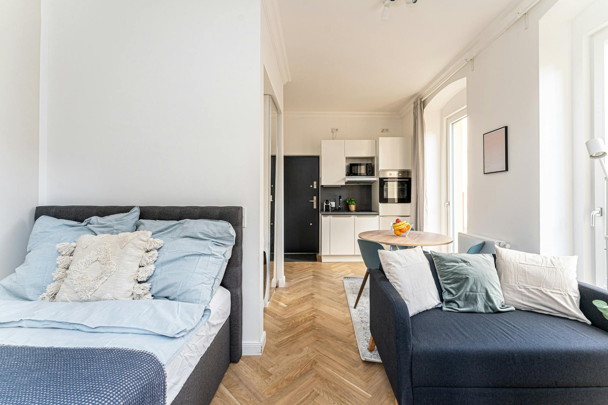 Das gemütliche Wohn- / Schlafzimmer ist mit einem komfortablen Boxspringbett (Hotelstandard) ausgestattet und begeistert mit bodentiefen Fenstern, die für eine helle und freundliche Atmosphäre sorgen. Der Esstisch mit drei Stühlen lädt zum gemeinsamen Essen und Verweilen ein.