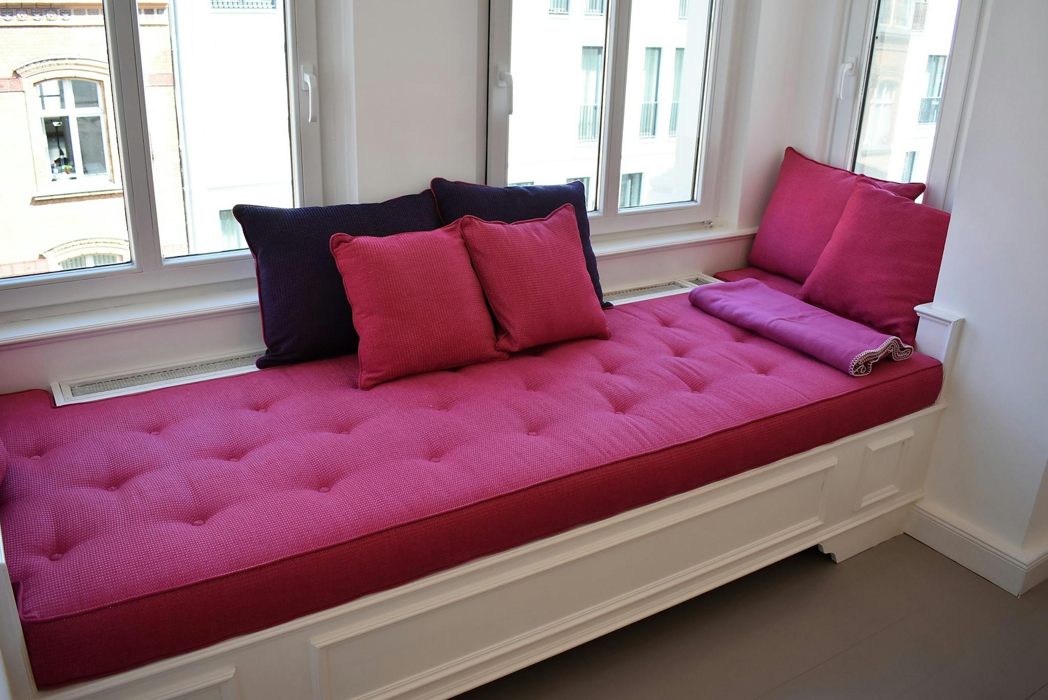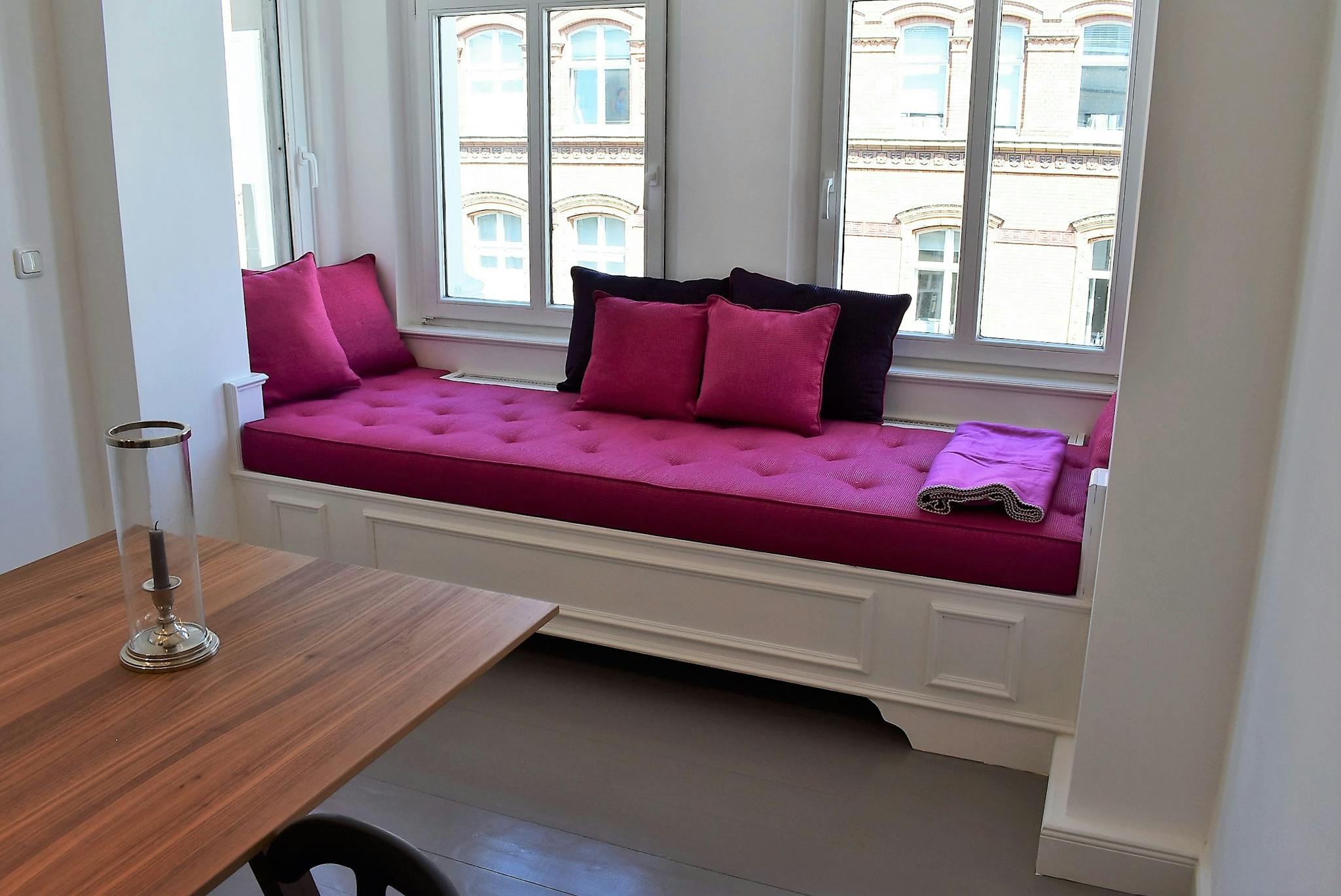 This charming ALTBAU apartment has been decorated with an eye for design, primarily in black/white/grey but with splashes of pink colour and interesting features like the custom-made sofa in the large dining/office room, surrounded by a victorian bow-window facing the lively Zimmerstrasse. The spacious living room with 3 couches can be easily turned into a second indipendent bedroom. Further advantages are a balcony facing a quite courtyard and 2 bathrooms, one even displaying a bidet (rare in Germany).