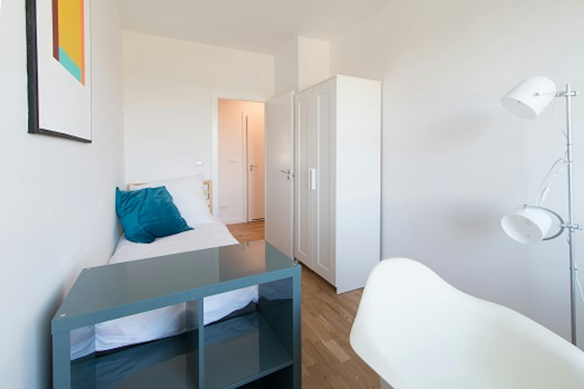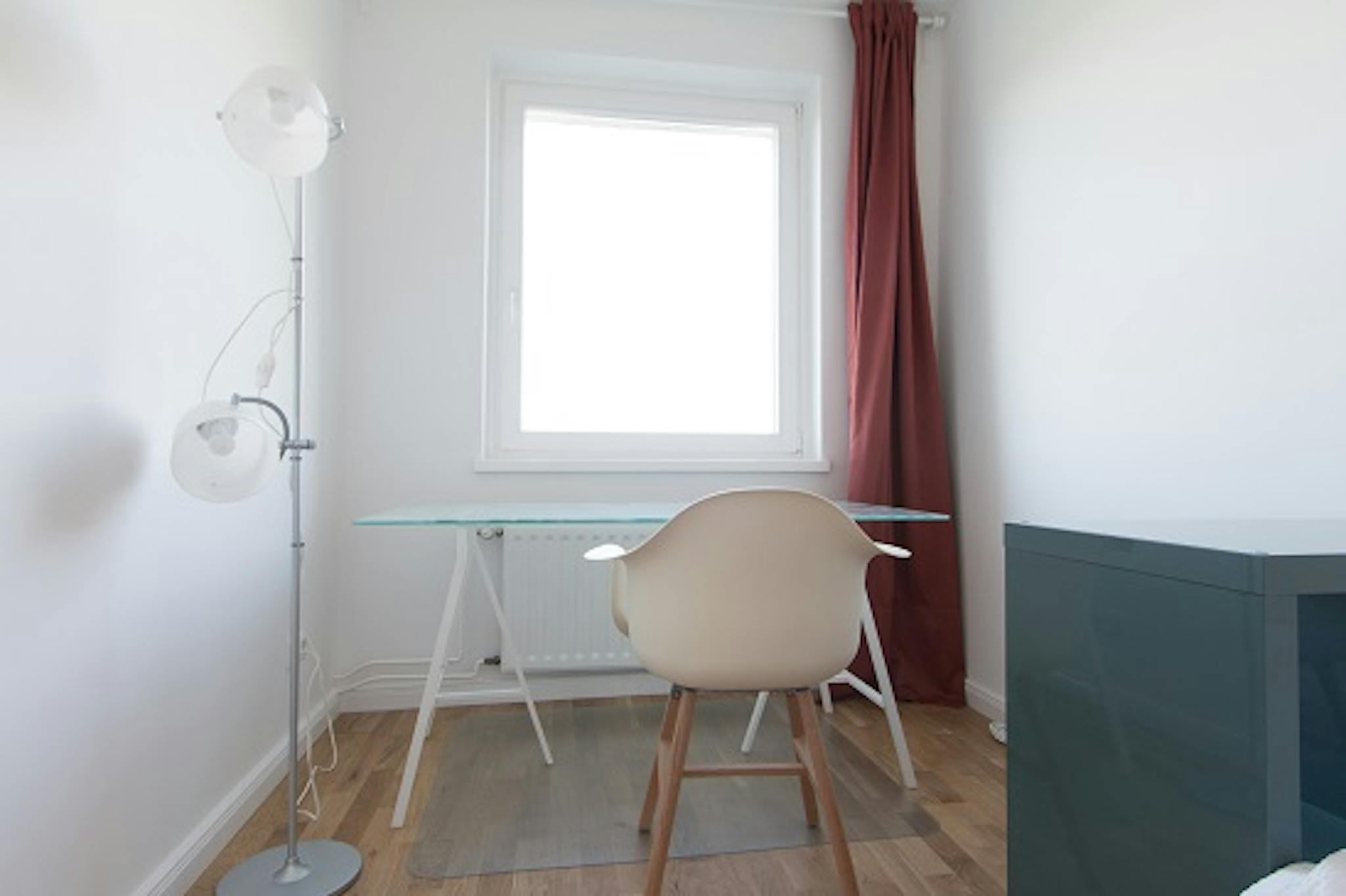 Our student-friendly apartment is located on Neltestrasse, in a calm neighbourhood with a beautiful view of nearby greenery. It’s a third floor apartment with 4 bedrooms. This room has a single bed.