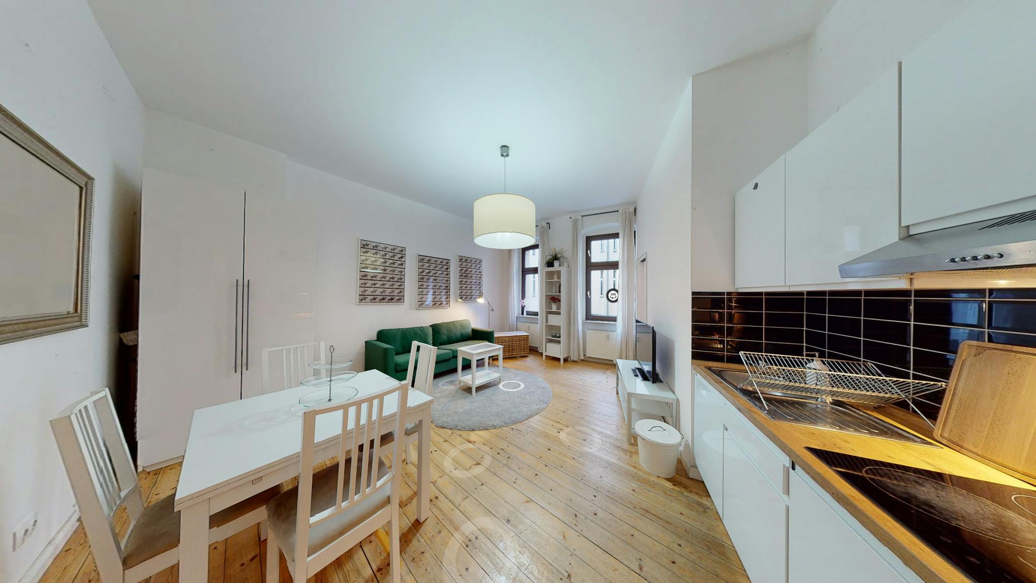 Just 15 minutes away by foot from the Technische Universität, this unit is a perfect place for students looking for space and comfort at an affordable price. It has a living room with a modern open kitchen, a separate bedroom with a double bed and a shiny bathroom with a washing machine. It is also well connected to other parts of the city through bus lines 101 and 245, right outside the door.