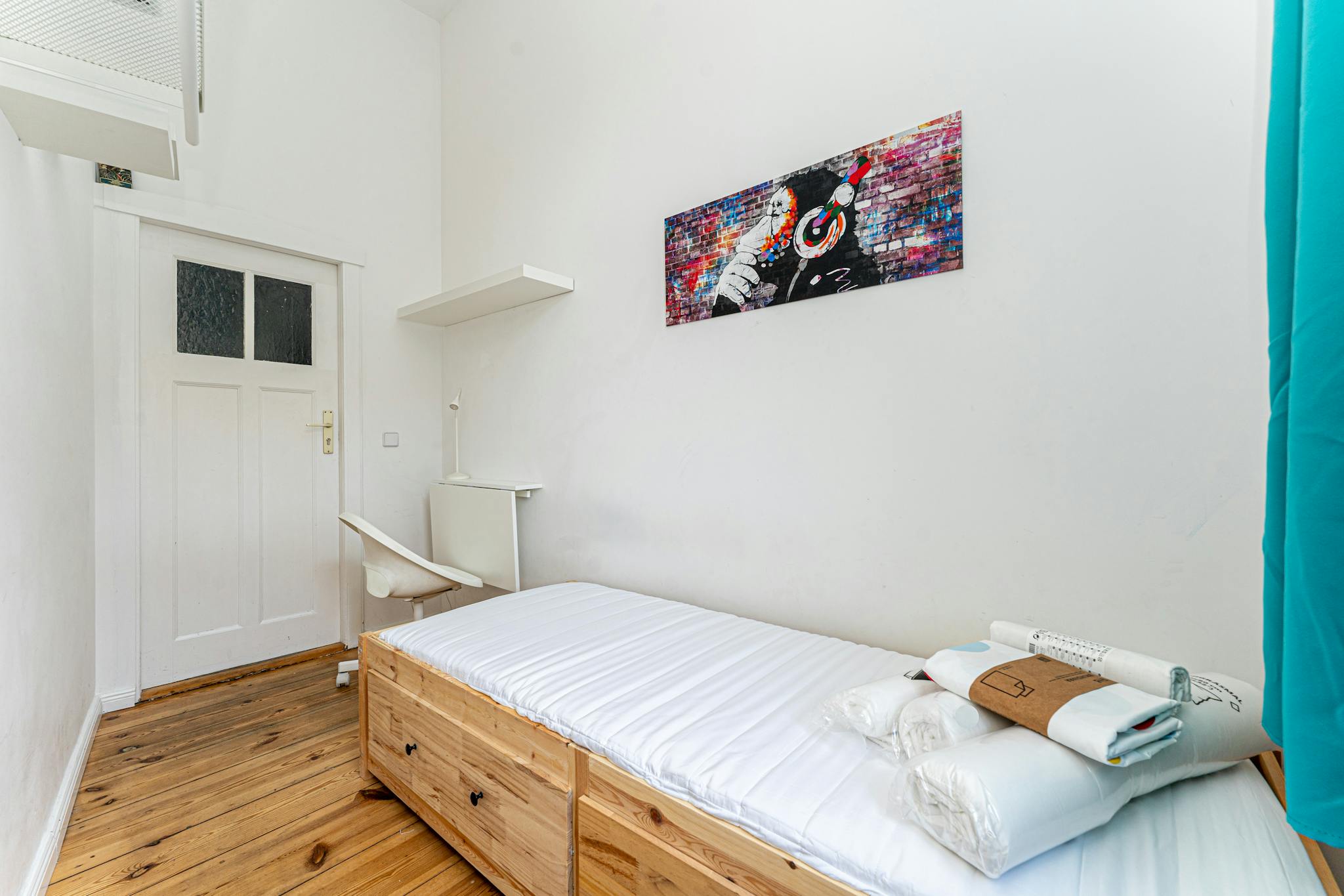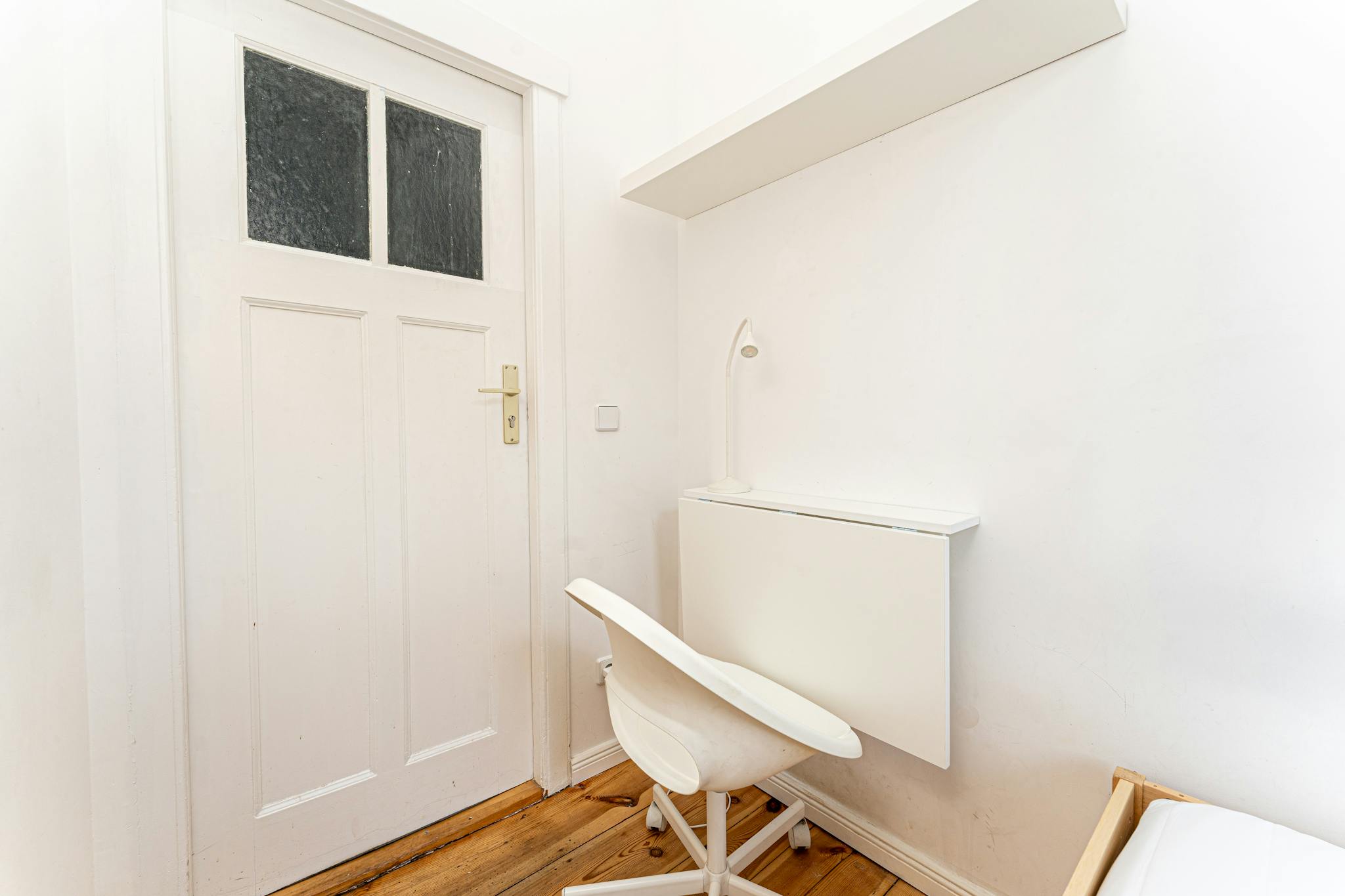 • Fully furnished with a desk, chair, and wardrobe