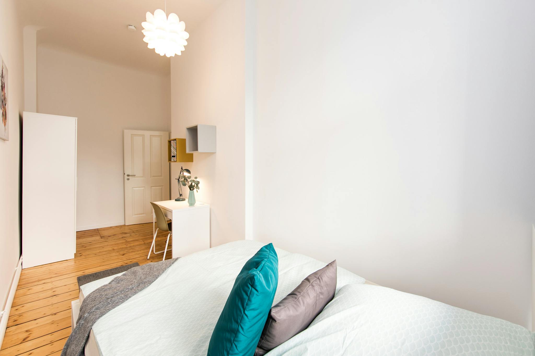 Fully furnished with a comfy bed, desk, chair, and wardrobe.