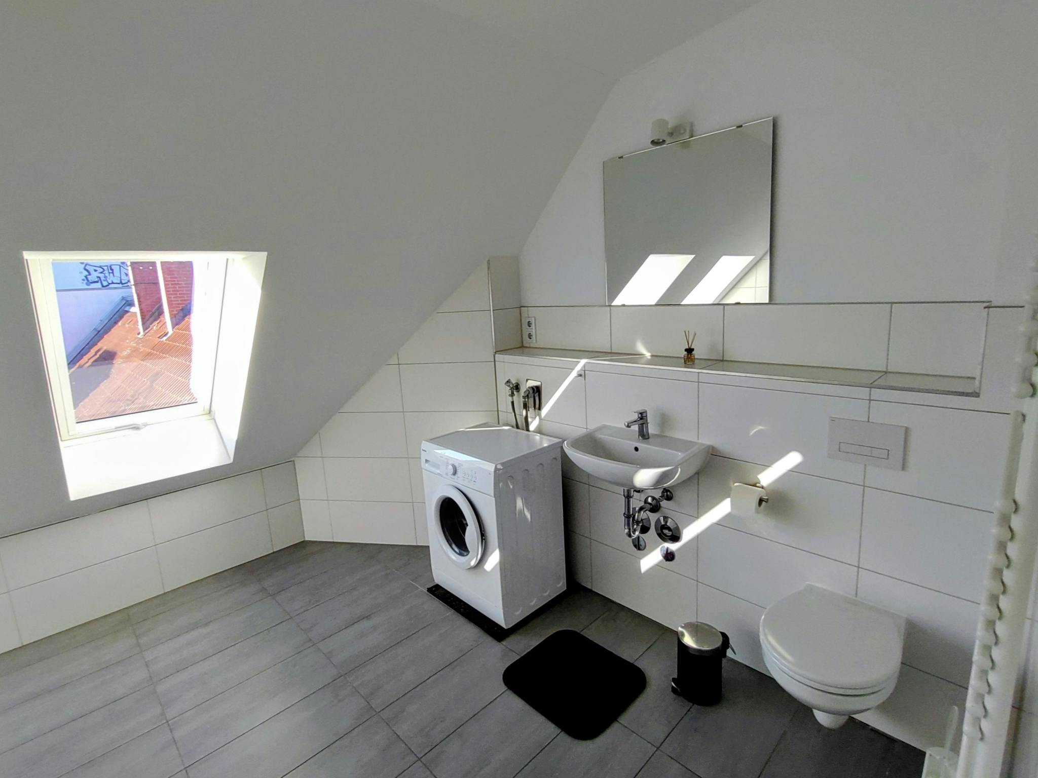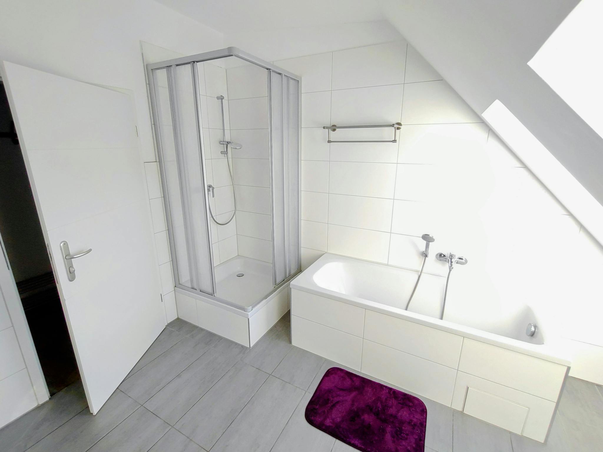 The bathroom has a shower cubicle, bathtub and washing machine.