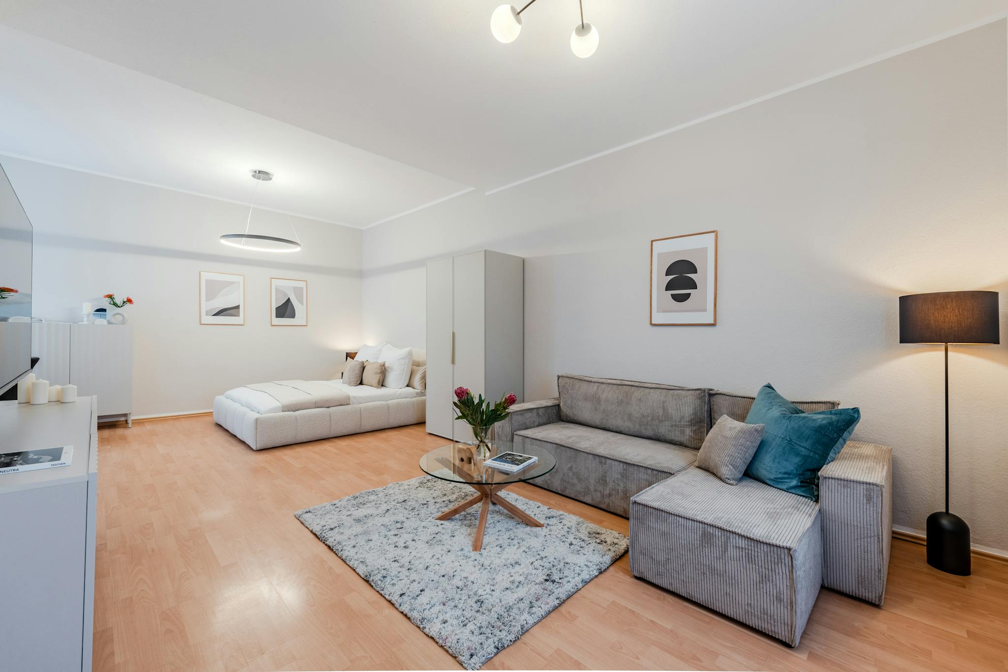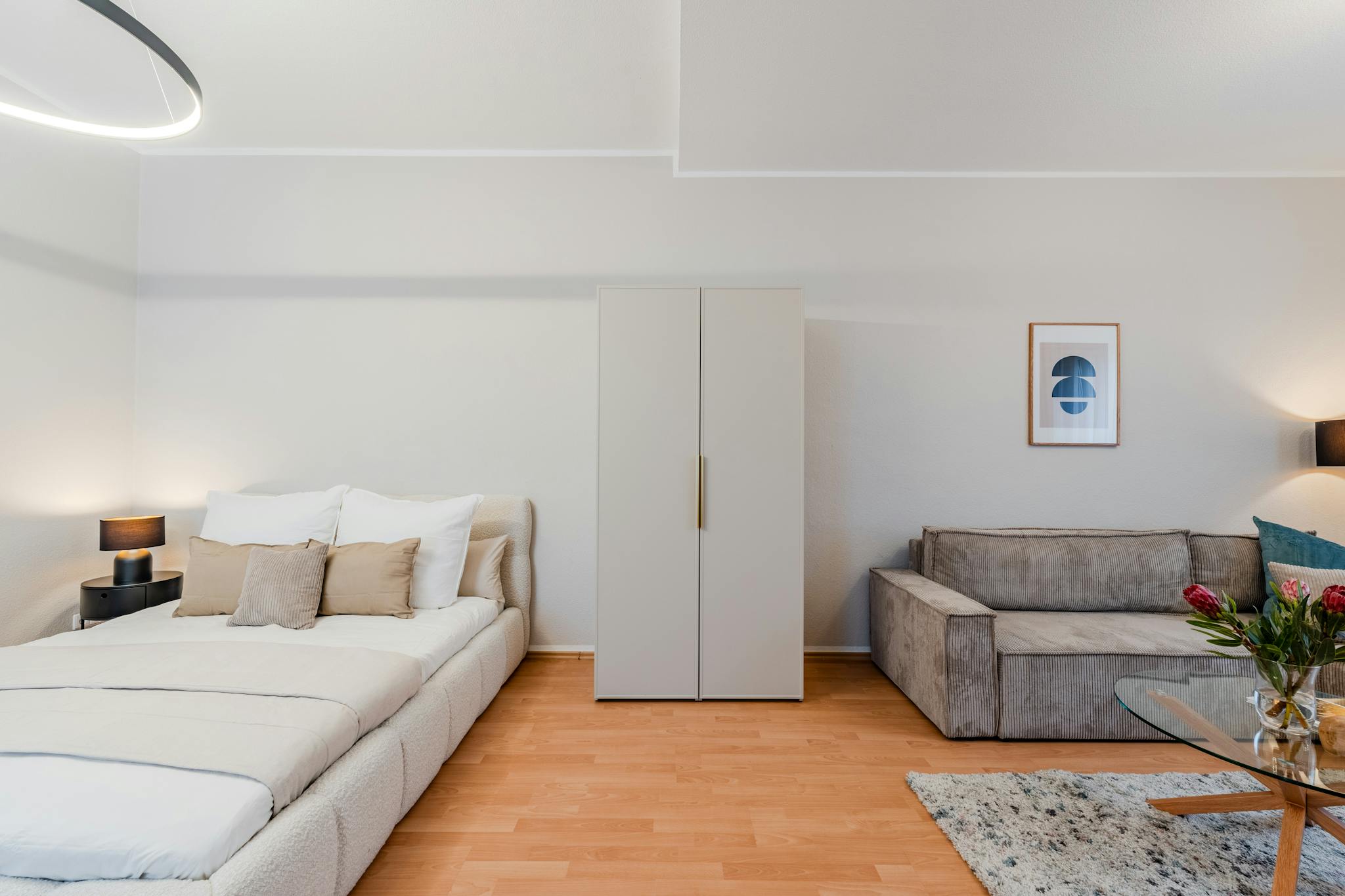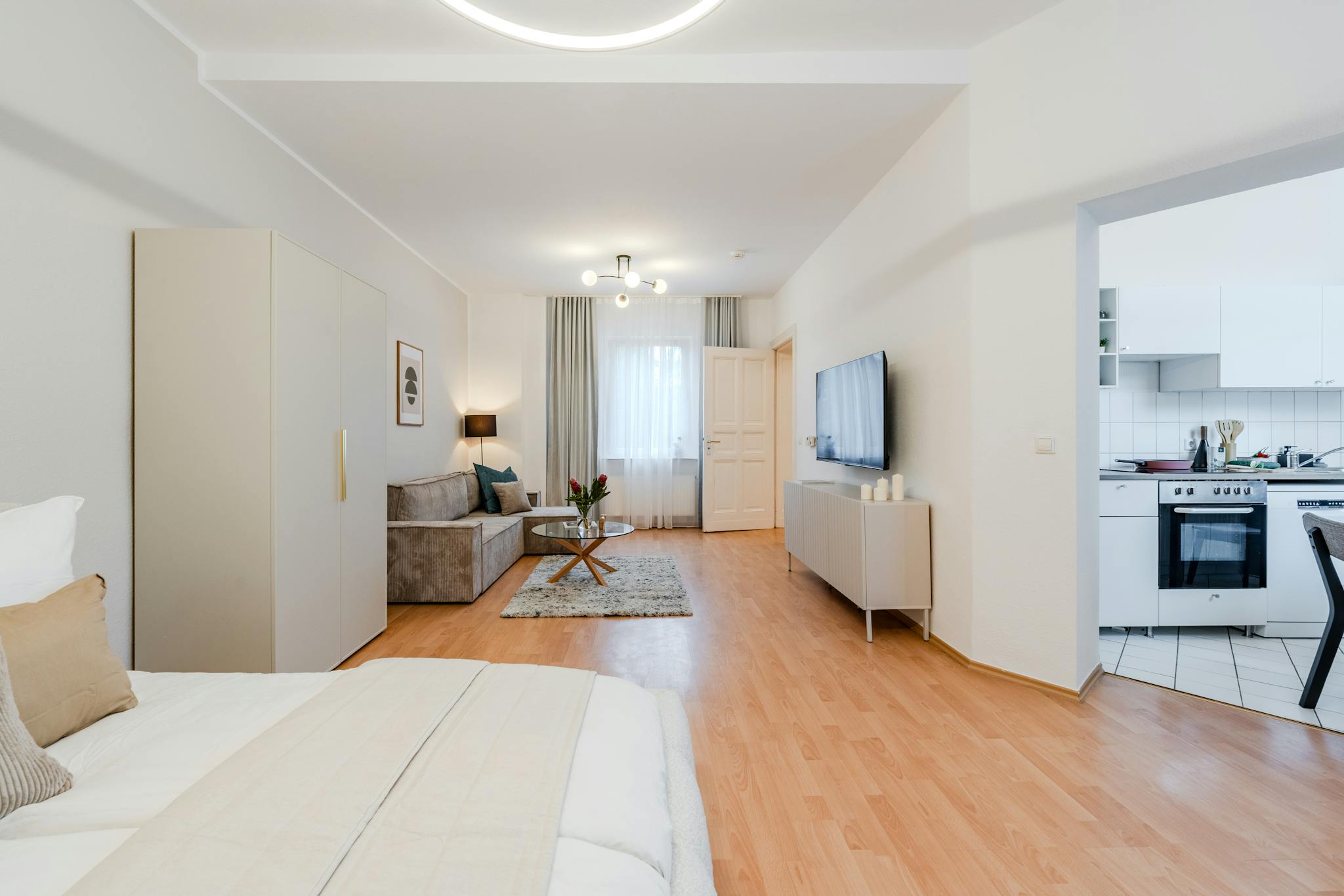The apartment features an open-plan layout with two distinct areas: the living room and the bedroom. The bedroom area is well defined, furnished with a comfortable double bed, a large wardrobe for storage, and a working desk situated by the window, making it ideal for productivity with natural light streaming in. The living room includes a cozy convertible sofa, perfect for relaxation or as additional sleeping space, and is equipped with a 4K TV and high-speed Wi-Fi, creating a balanced environment for both work and leisure.