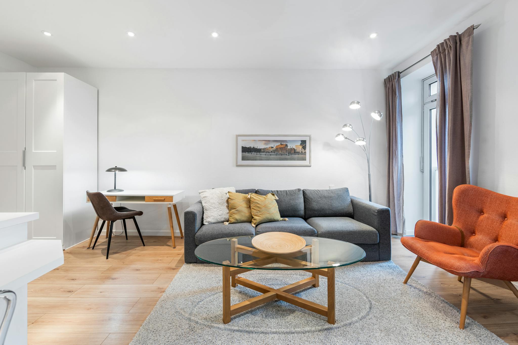- living area with sofa, Lounge-chair, workstation , dresser, smart-TV
