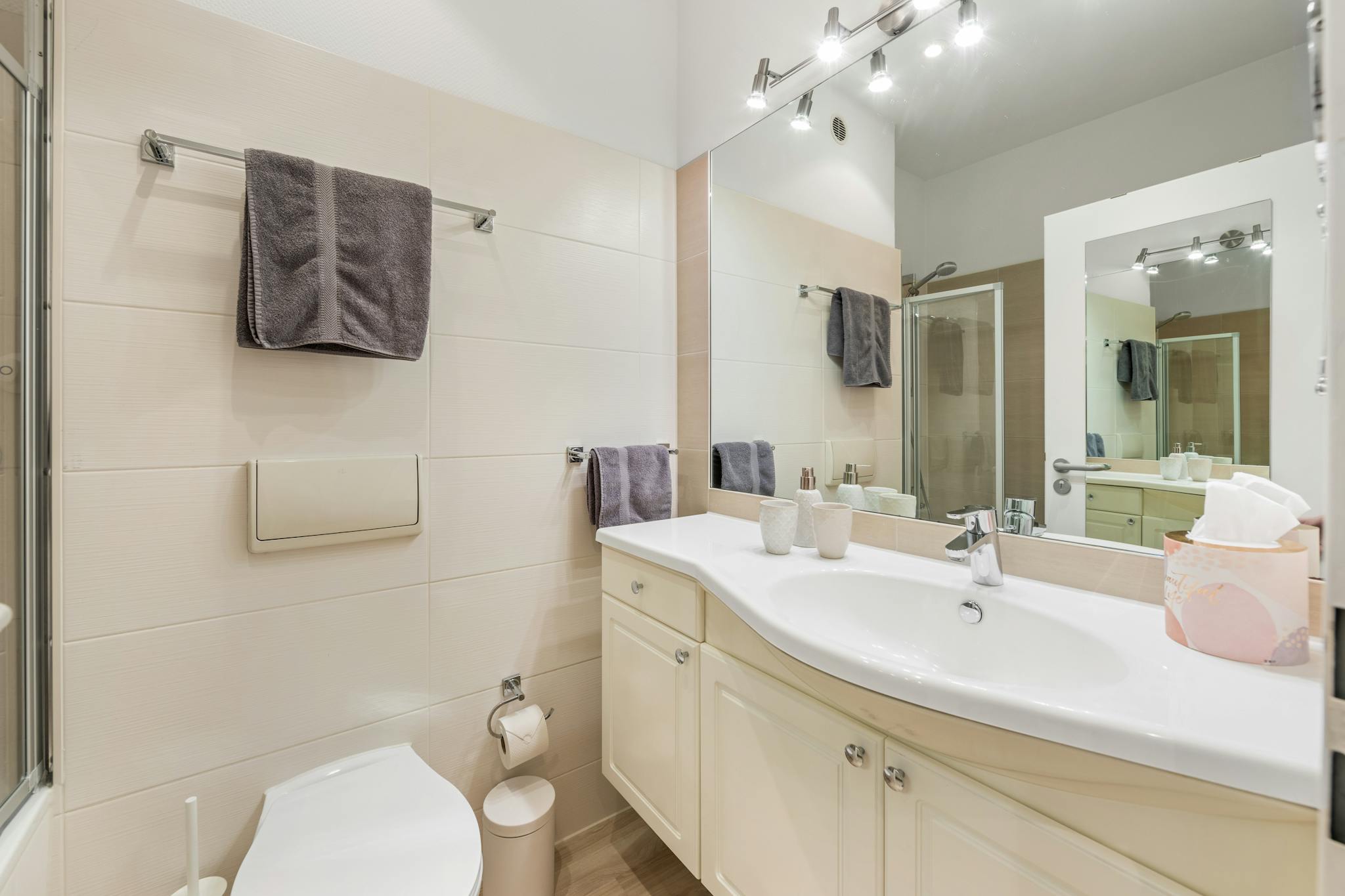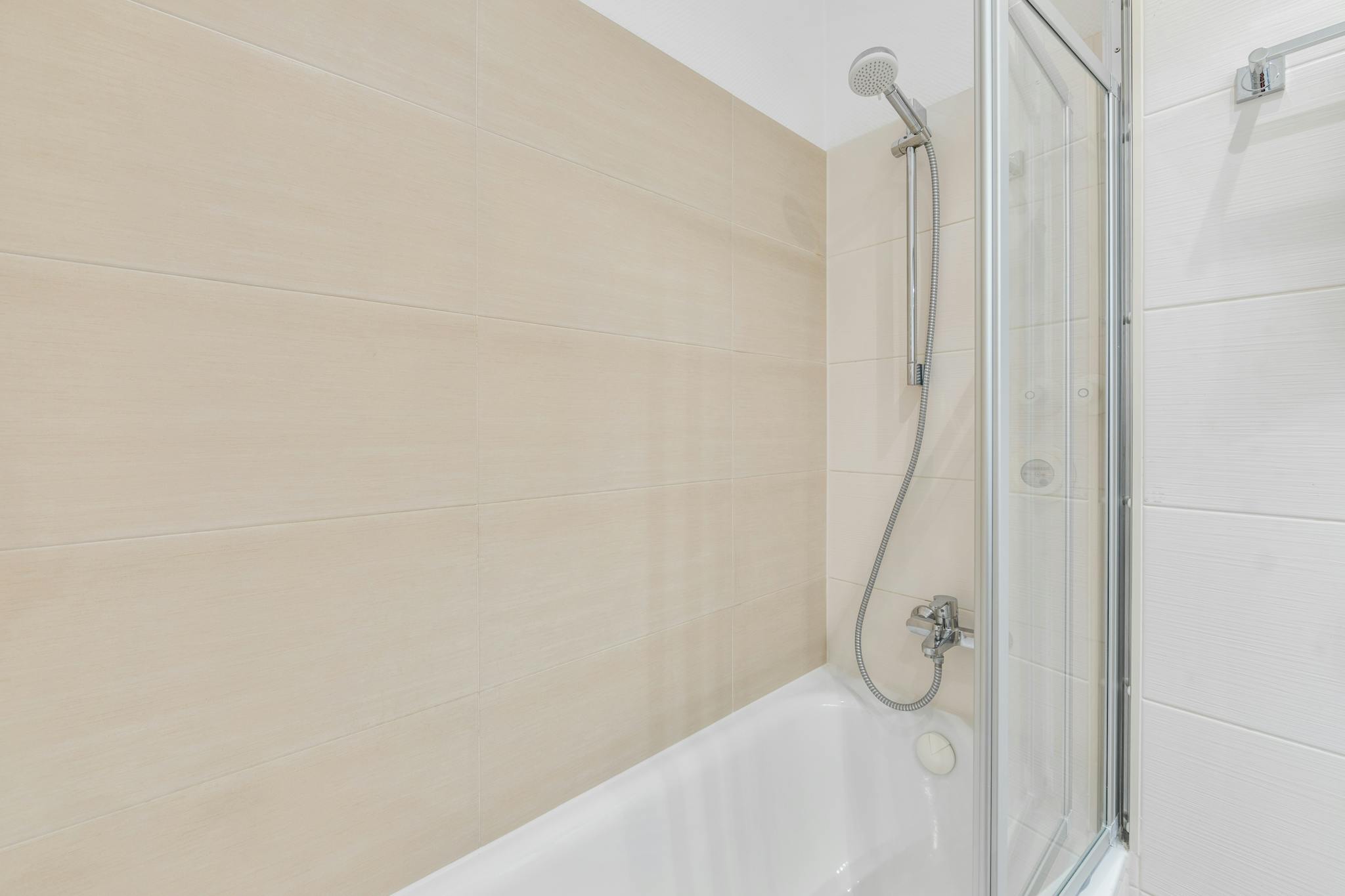 - bathroom with bathtub and glass shower screen, towels, hairdryer