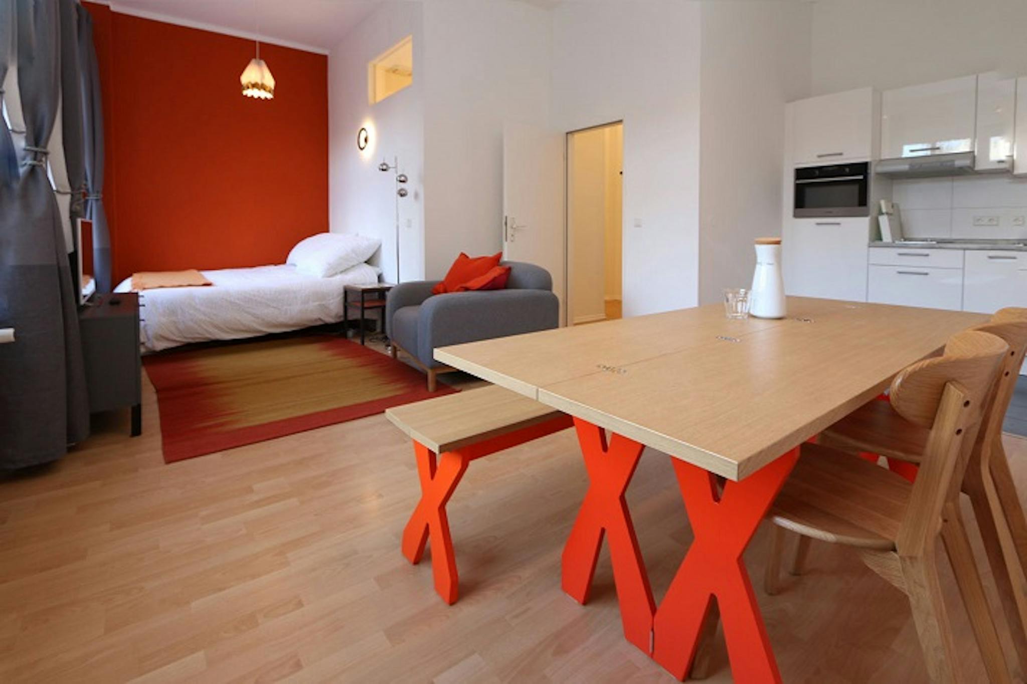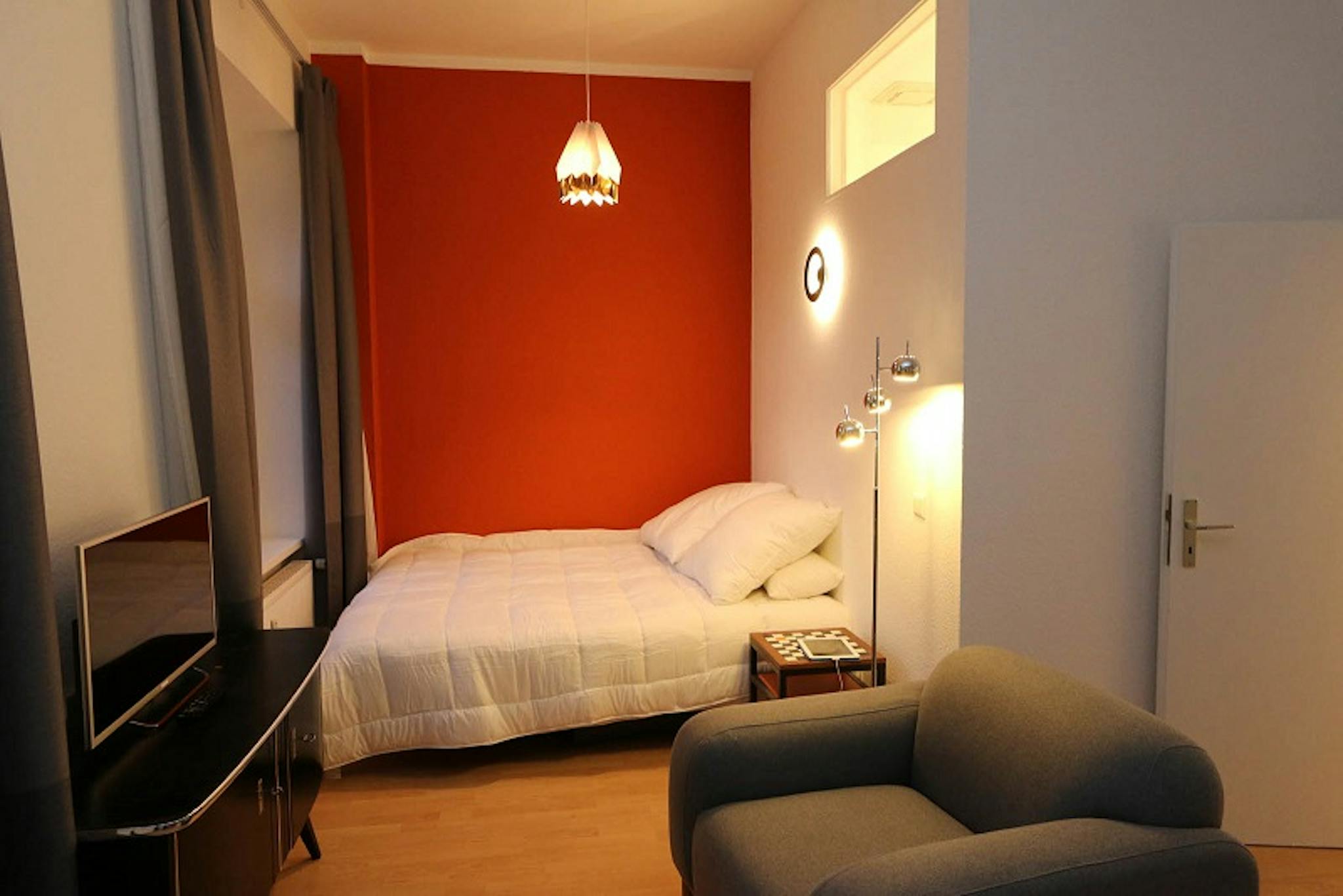 Our lovely apartment is nestled in the highly-prized area of Prenzlauerberg, in the Winsviertel Quarter of the former East Berlin. Old-timers and newcomers appreciate its mix of urban bustle and suburban-style calm, in a neighbourhood thriving with boutique workshops, shops and restaurants – all close to the property. It is just a short walk to three different tram lines, one taking you to Alexanderplatz in less than 10 minutes. Our apartment in this late 19 th -century building has high ceilings and very large windows opening on a quiet green playground. Recently renovated in bright colors, it is full of light, even in winter. We took special care to showcase the work of young or cult designers we like, as you can see in the materials and colors used to transform this living space. We wanted to give it a “feel good” vibe. The apartment has a brand new white lacked kitchen, and all you need to cook gastronomic or on-the-go meals: an oven, microwave, dishwasher. It has a bar-type area, bar stools, and comes equipped with Limoges porcelain ware, French iconic glasses, sharp ceramic knives, and of course, an fully automated espresso and cappuccino maker. The apartment offers a large double bed, roomy closets, a flatscreen LED-TV with cable featuring international channels, and free wifi (100Mb).