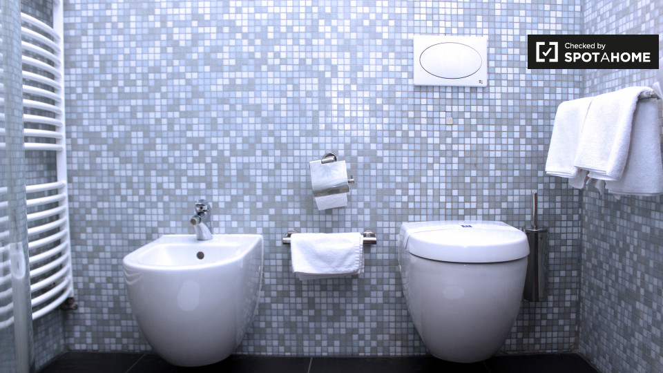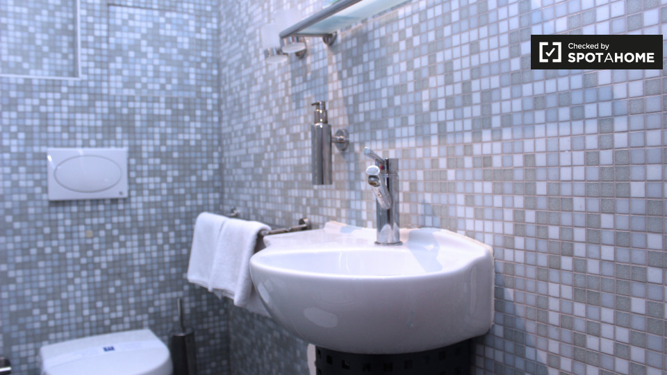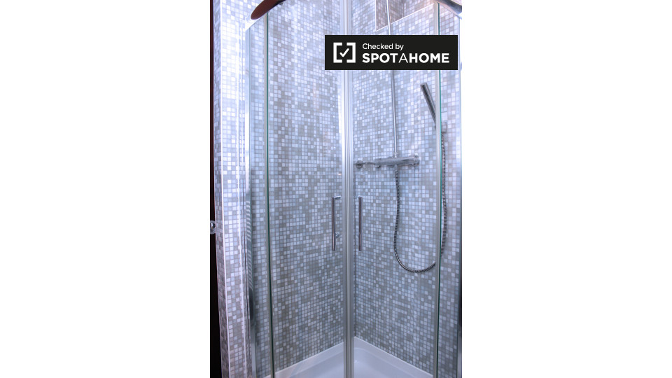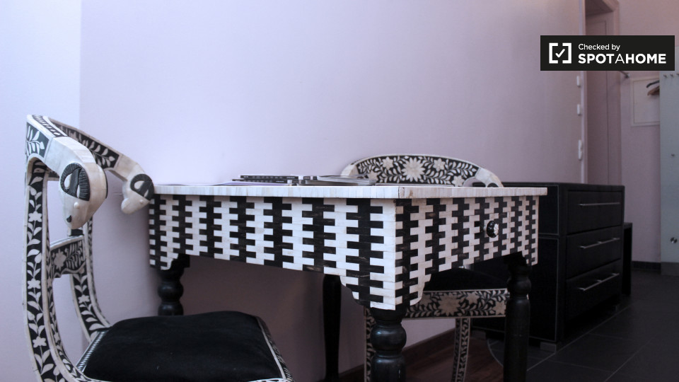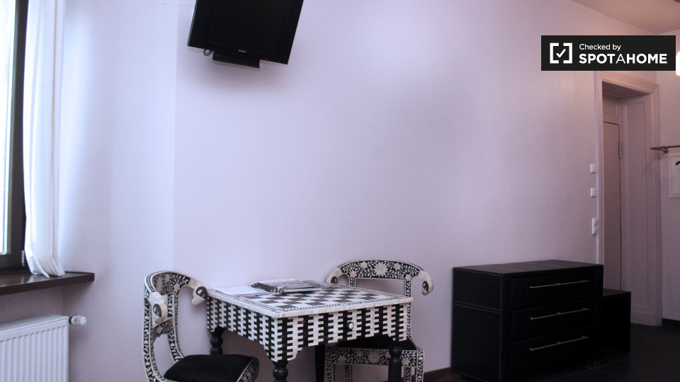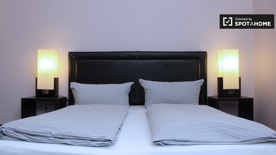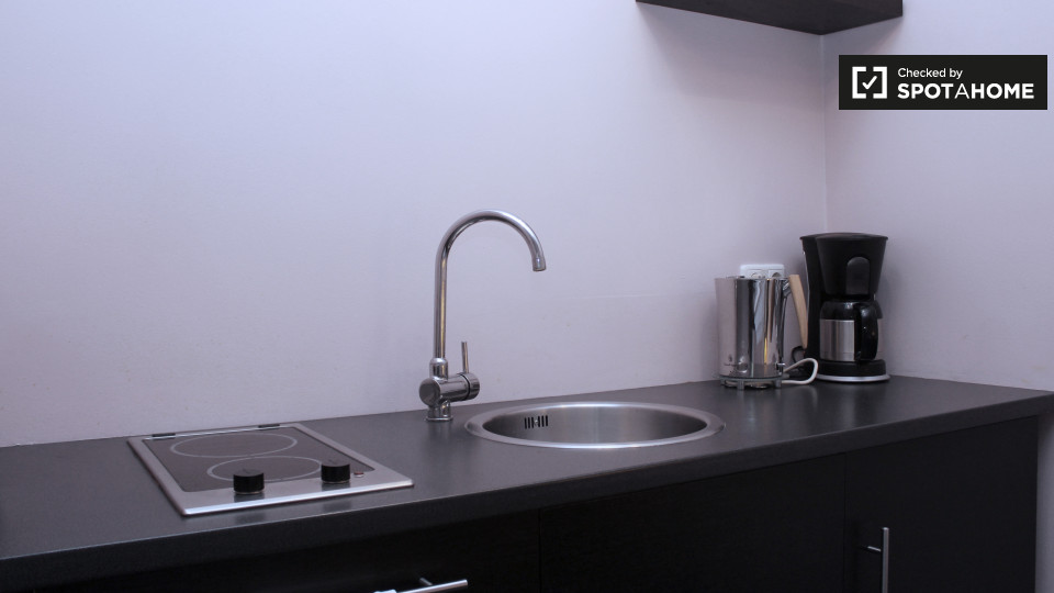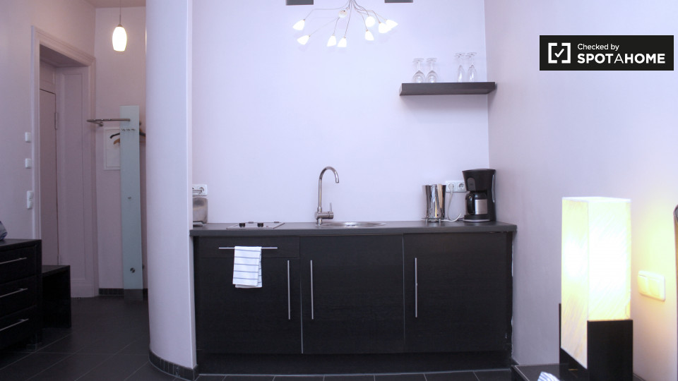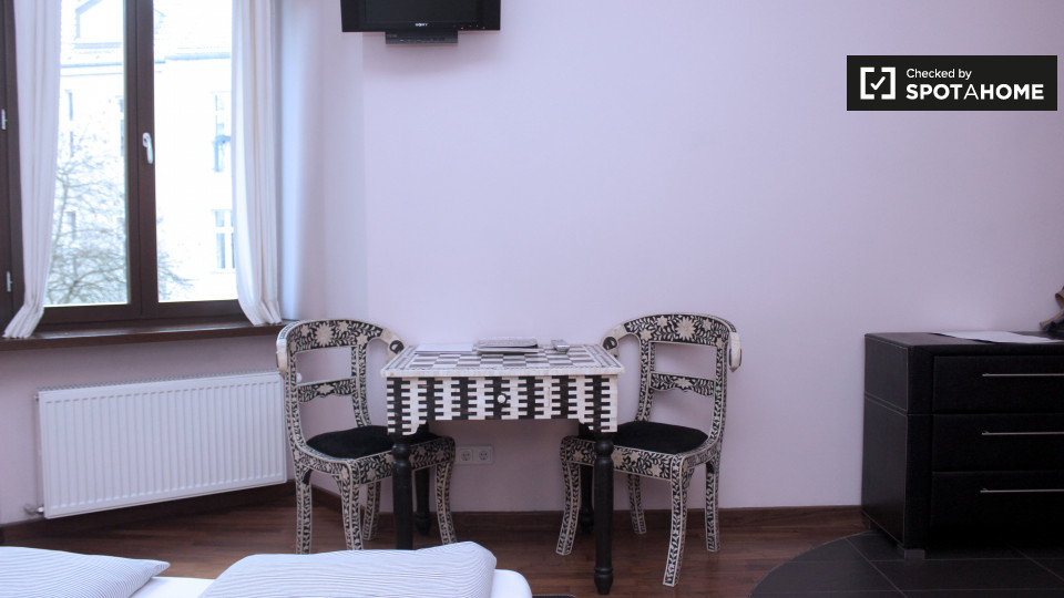 Pets not allowedNot allowedA modern and stylish studio apartment is available to rent in Schöneberg, Berlin. The bedroom has a double bed, a TV, and plenty of space to store clothes or relax and enjoy a meal at the funky table and chairs. The kitchen has all of the essentials, including a small electric stove, a mini-fridge, a kettle, utensils, and crockery. The bathroom is also modern, and it has a big glass shower in it.