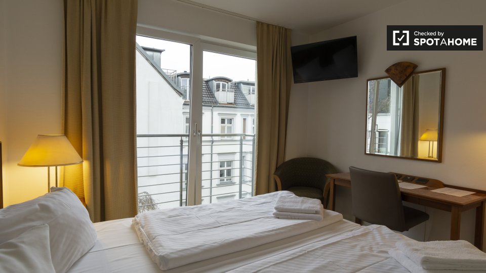 The apartment is flooded with light due to the beautiful, modern and large windows and its French balcony, the high quality curtains preserve for sure the tenant‘s privacy.