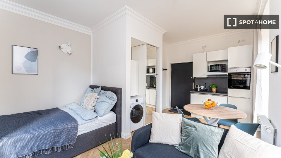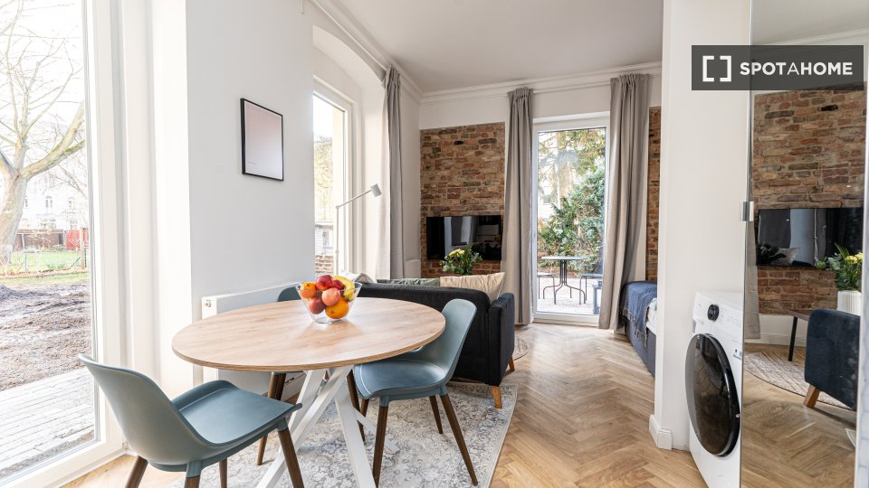 Pets allowedAllowedThis lovely studio in Berlin offers a comfortable living space, perfect for solo tenants or couples. The apartment is furnished, featuring a central heating system for comfort, and includes all major appliances such as a washer, dryer, and dishwasher—all creating a seamless living experience. The equipped kitchen is ready for your culinary experiments, and the balcony provides a nice outdoor space for relaxation. Smoking is not allowed, but pets are welcome in this inviting home. The saving grace is that all utility bills are included in the rent.