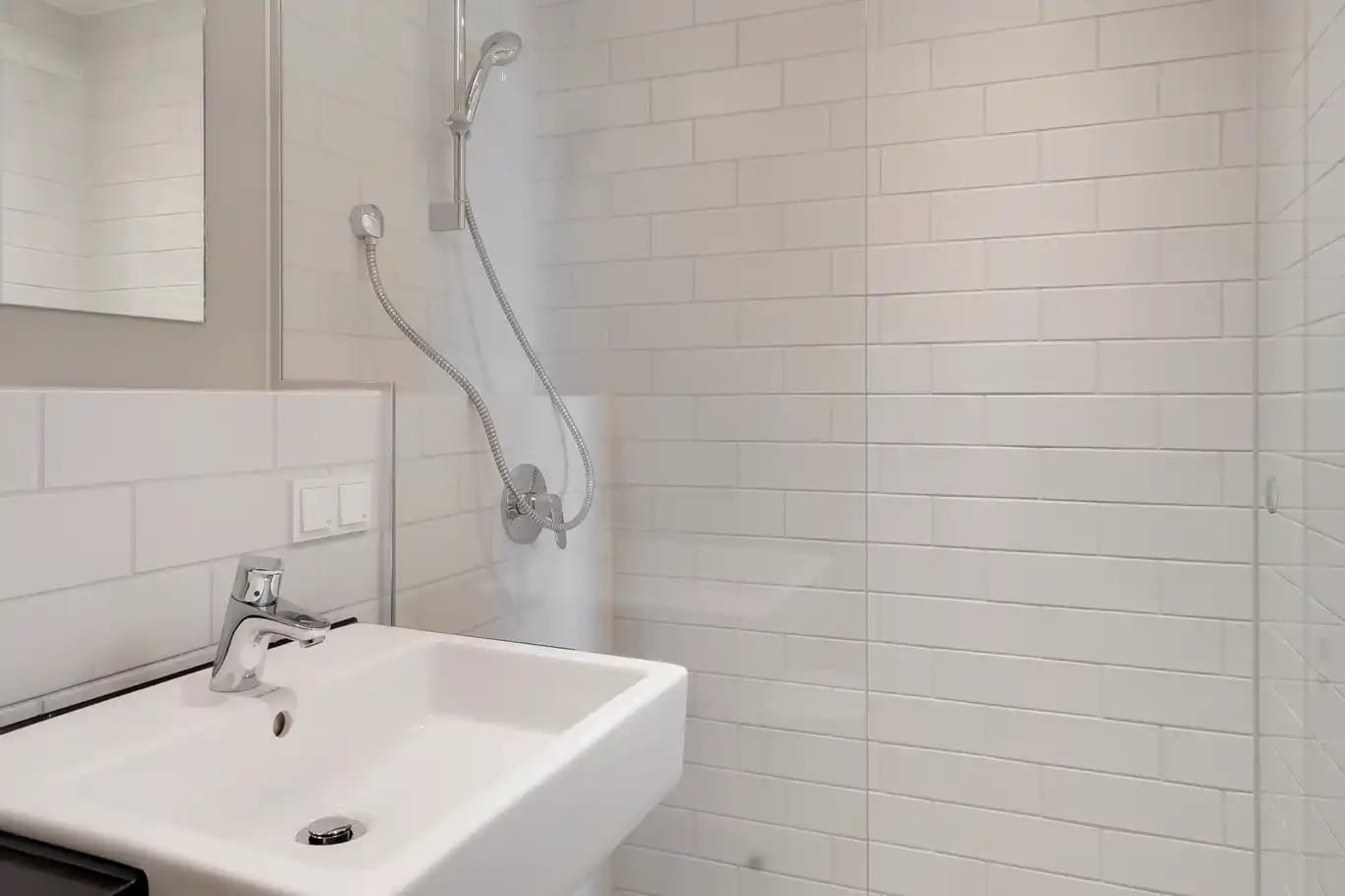 Shower, Towel rail heater, Mirror, Washing machine, Sofa Bed, Wardrobe, Curtain rods, Cutlery, Pans & kitchen accessories, Fitted kitchen, Refrigerator, Microwave, Dishwasher, Iron, TV, Working desk, Vacuum Cleaner, Lamp, Chairs