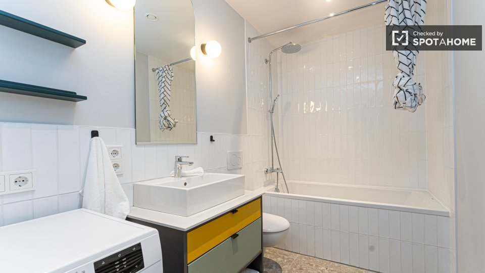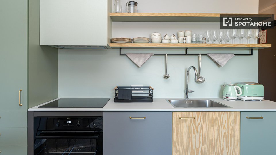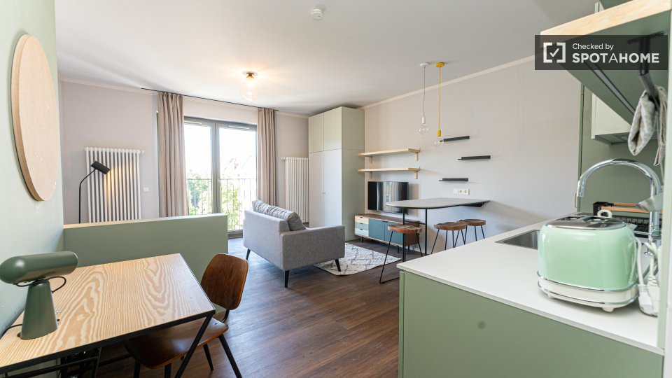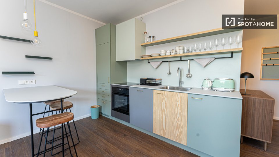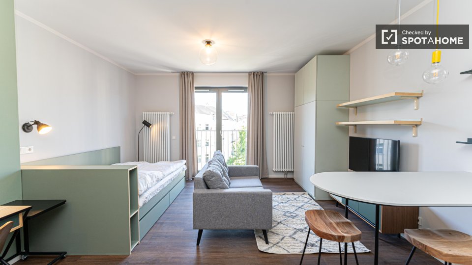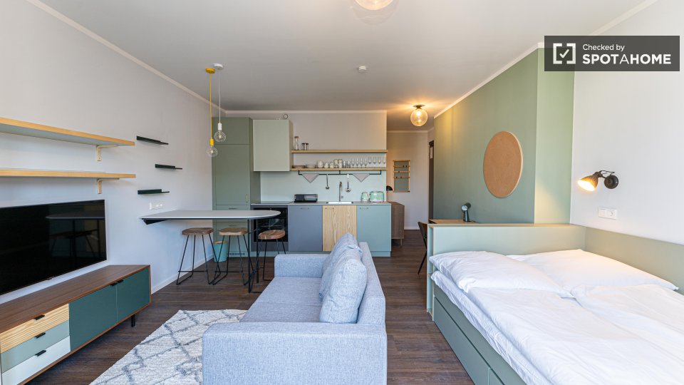 Explore this charming studio for rent in Berlin. The property comes fully furnished and is equipped with an oven, a dishwasher, and a private washing machine for your convenience. Enjoy the amenities provided, such as a common dryer and television. All bills, including electricity, water, gas, and Wi-Fi, are included for added comfort. The studio has been checked and verified by Spotahome to ensure a high standard of living. Situated in Berlin, the area offers an array of dining options nearby, including Bring'n Pizza, Pizzeria Mimo, and Viet Bowl Böhmischer Platz. You can also explore the Rixdorfer Schmiede and Estrel Springbrunnen, both notable attractions within walking distance. Book your new Berlin home today with Spotahome.