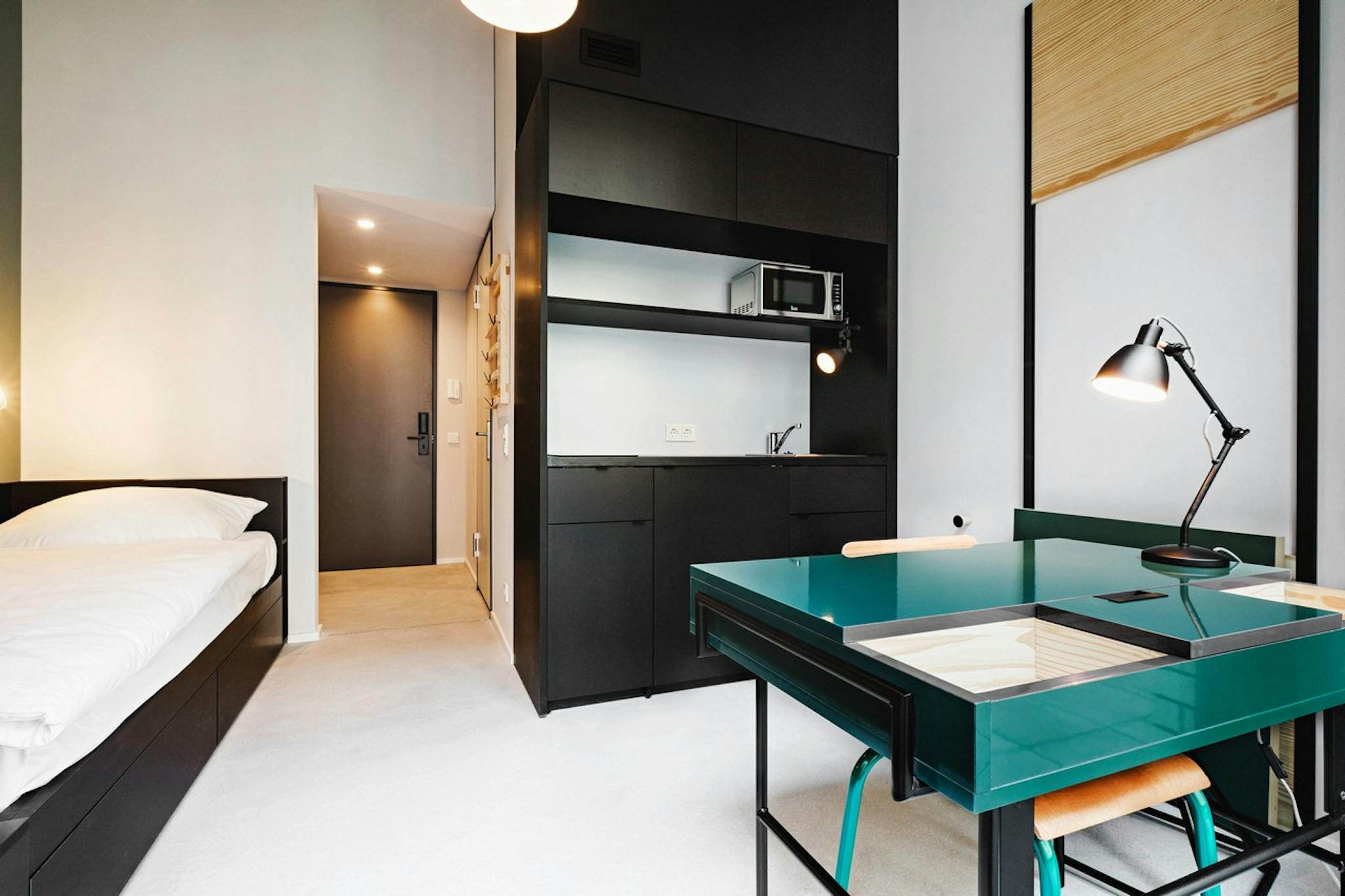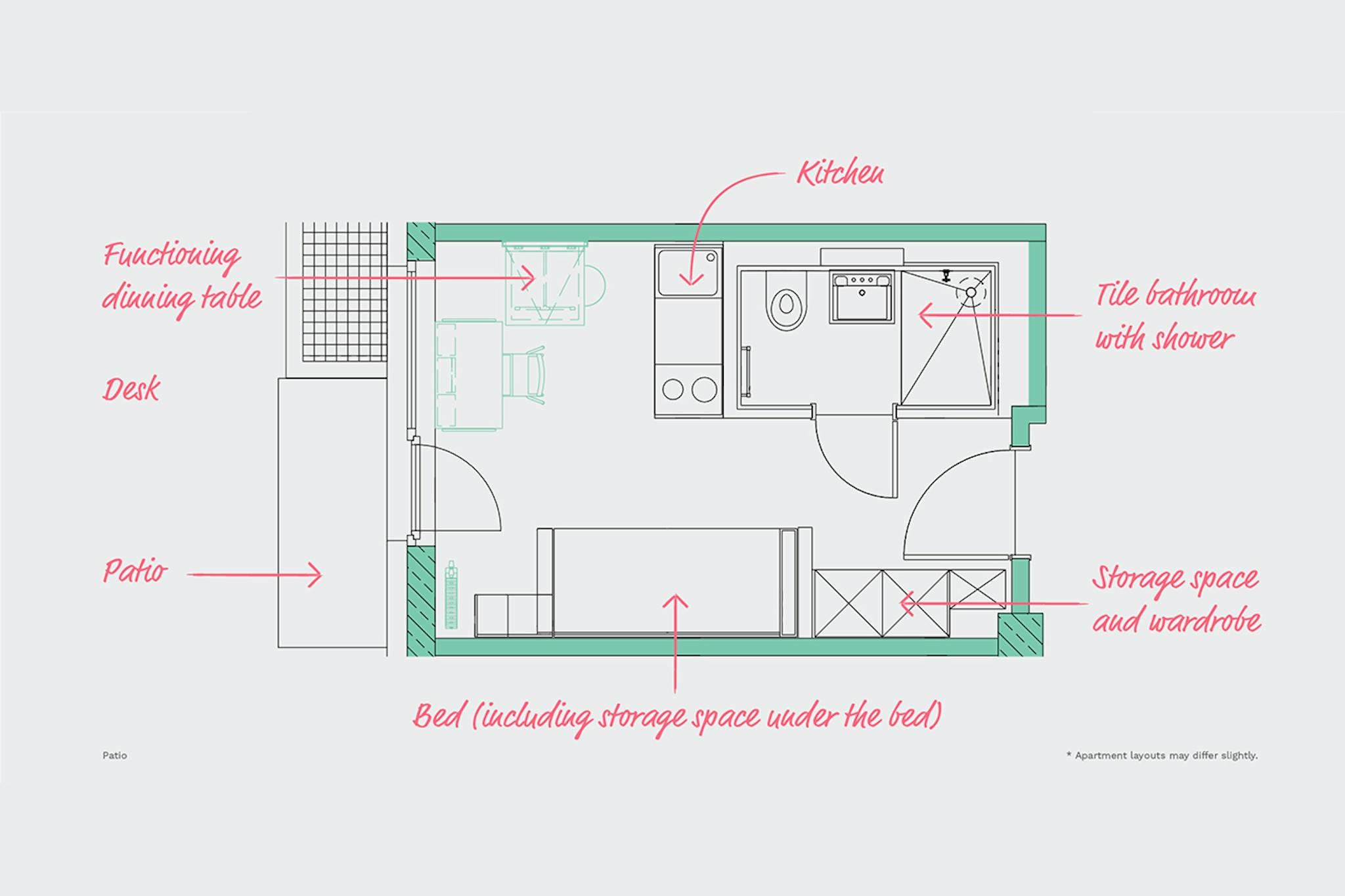 On the ground with 18 Square meters, plus outdoor space, no apartments offer better courtyard access and personal privacy than our Patio apartments. Each Patio apartment is equipped with a 6m2 garden view, great lamps and custom designed furniture such as a bed, a wardrobe, a fully functional kitchen, a desk, a table for two and floor to ceiling windows. The elegant tiled bathrooms have beautiful basins, custom designed faucets and a spacious shower.