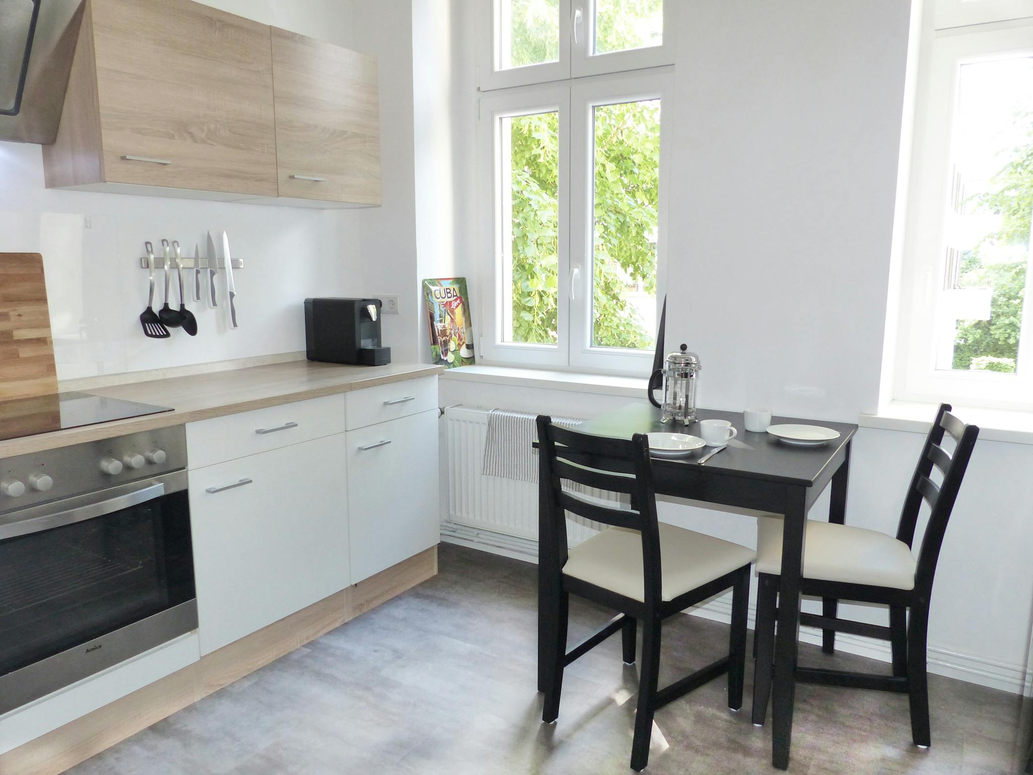 The fully equipped flat is perfect for singles or for a young couple. Renovated and furnished with love, it is a place to feel at home in the capital. The living room offers a dining table, a large sofa with a TV and desk space in the corner. In the eat-in kitchen, you will find everything to enjoy cooking and baking with friends. Next door is the bedroom with a balcony, which offers a large wardrobe and add a desk. The tiled bright bathroom is equipped with a toilet, sink with mirror and a shower cabin.