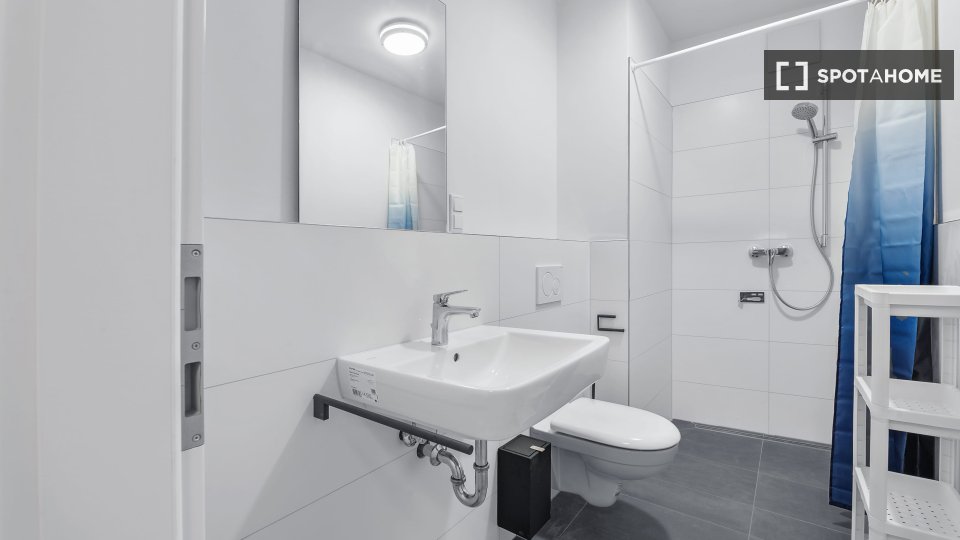 Shower, Mirror, Single bed (90x200), Wardrobe, Wardrobe, Cutlery, Pans & kitchen accessories, Fitted kitchen, Refrigerator, Microwave, Dining Table, Working desk, Vacuum Cleaner, Chairs