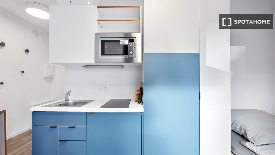 It is a studio, so it has an integrated kitchenette and its own bathroom.