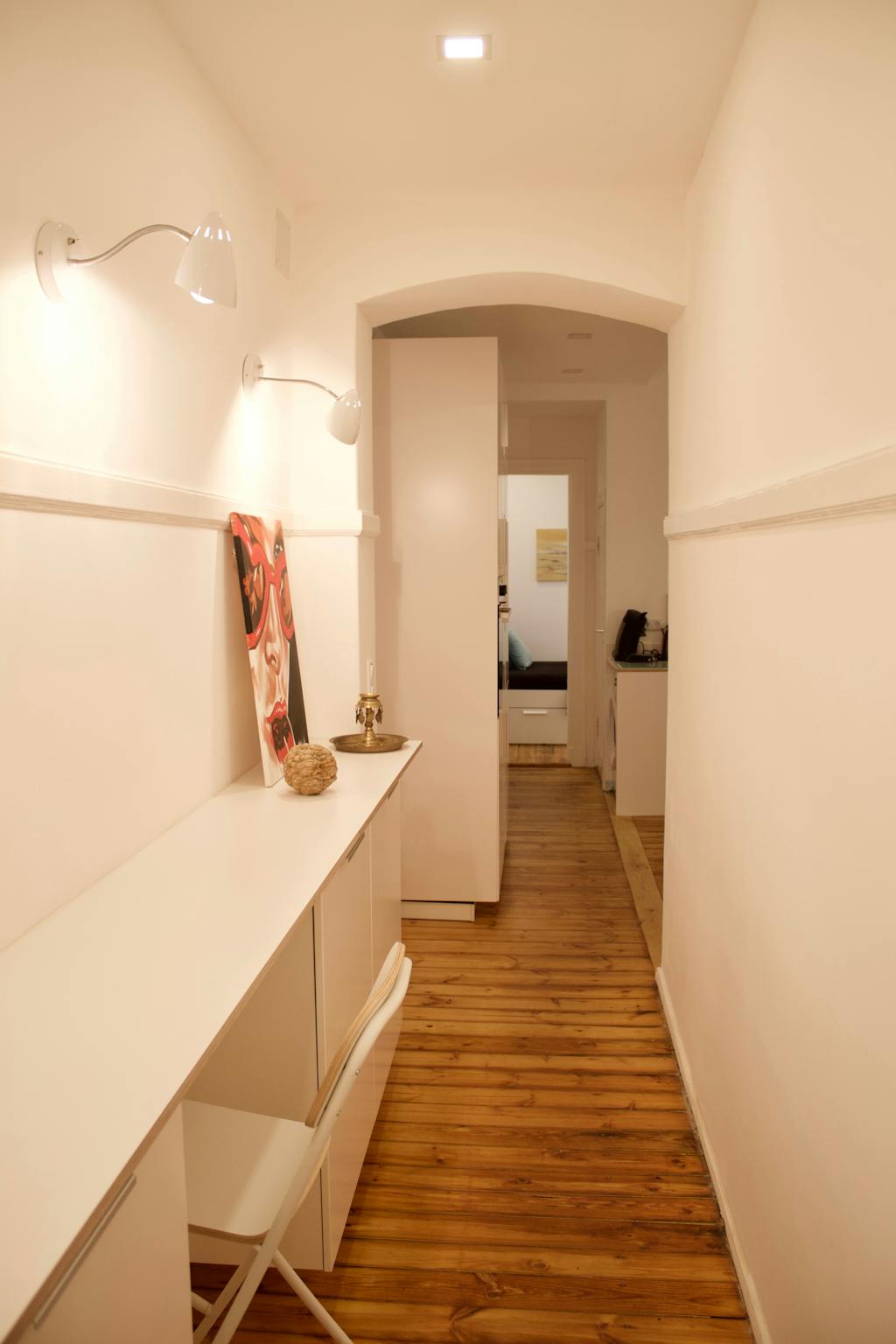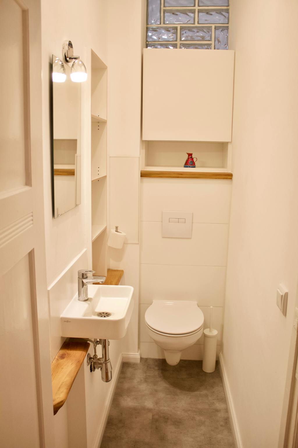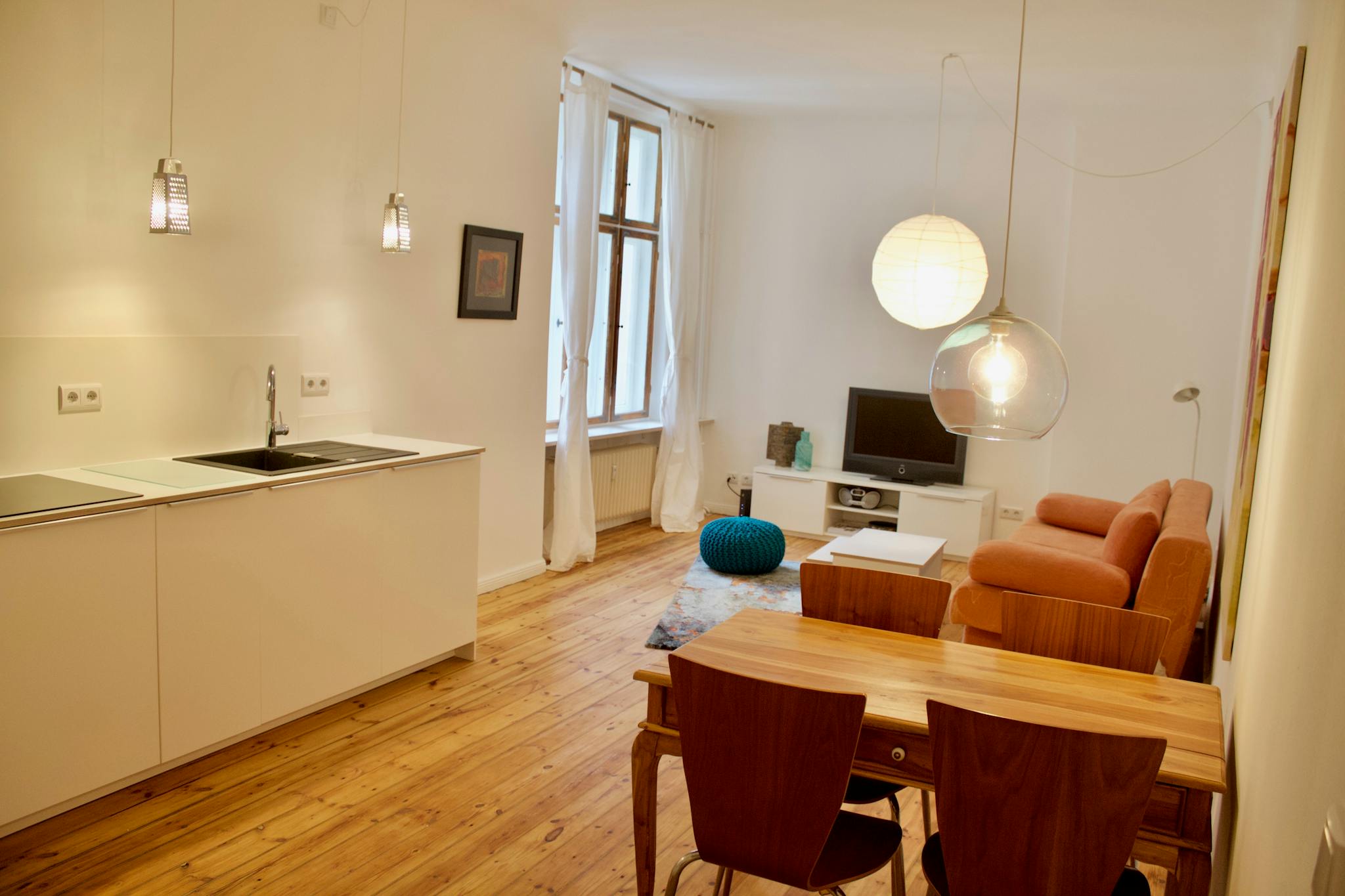 The flat itself is perfect for a single person or a young couple. High-quality renovated and furnished with love, a place where you can feel comfortable. In the hallway, there is plenty of storage space thanks to cleverly installed base cabinets, as well as a desk area. The large kitchen-living room is where daily life takes place. Directly adjacent to the kitchen is the toilet. Next door is the bedroom with its own shower. All ready to make you feel home 😊