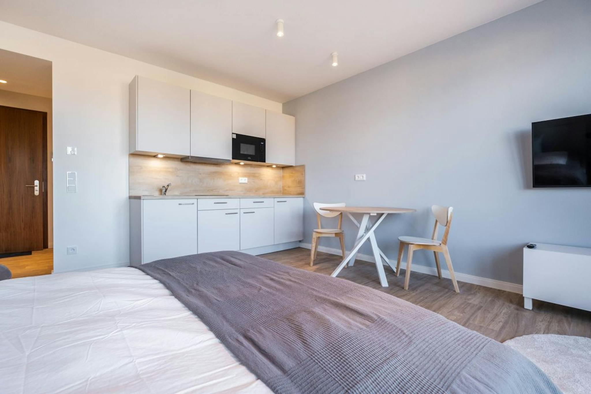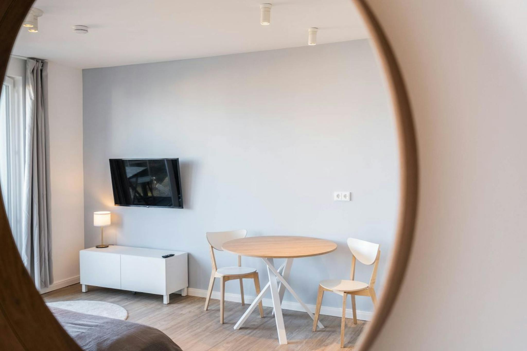 The interior of the studio is elegantly modern, featuring a sophisticated color scheme in white and gray tones, complemented by stylish furnishings. The kitchen is equipped to a high standard, encouraging culinary creativity. The studio provides a relaxing atmosphere with an additional dining area for intimate gatherings. Enjoy the pleasant weather on the balcony, and avail the washing machine at a cost of €5 per use, with WiFi accessible via hotspot.