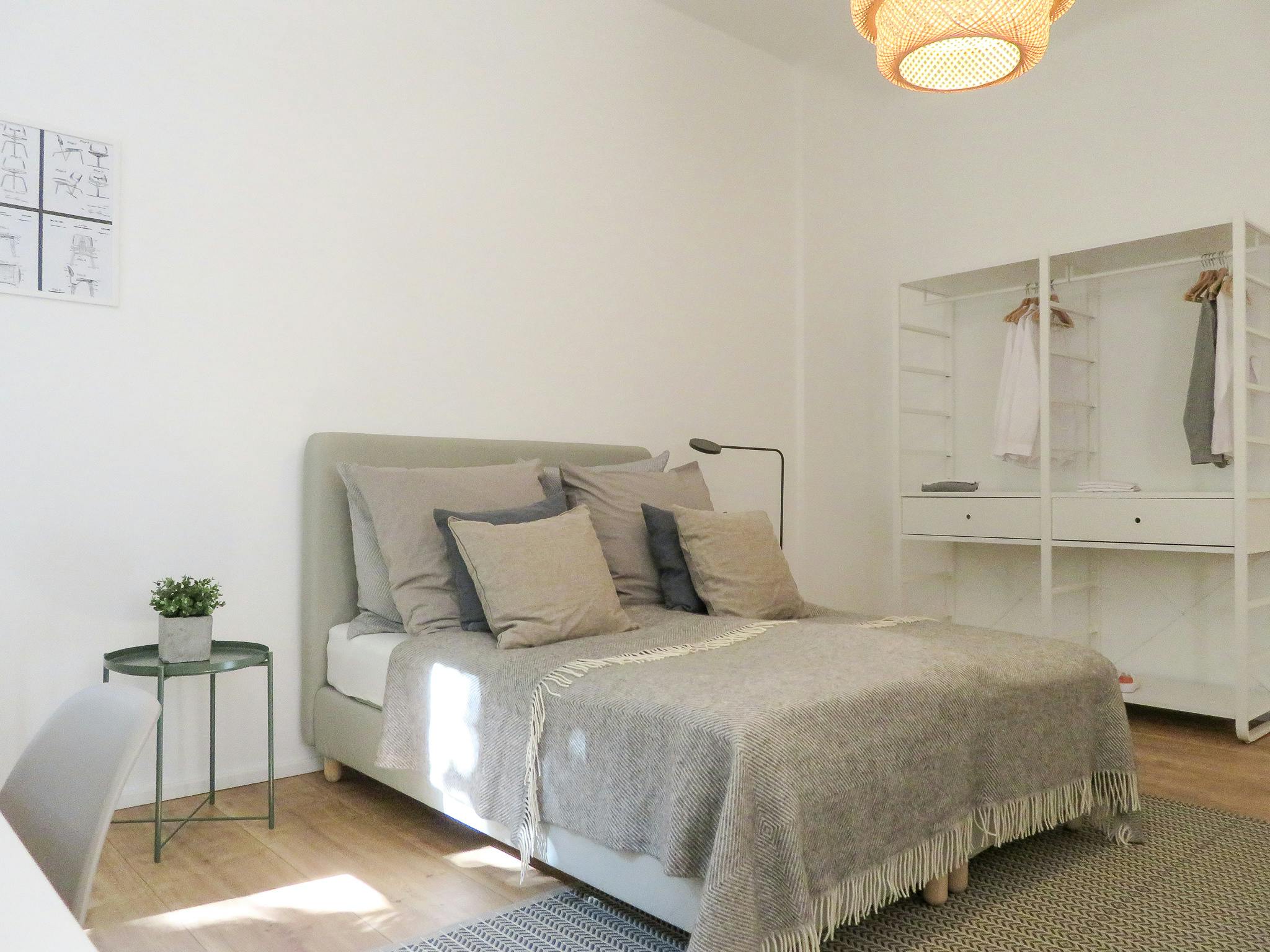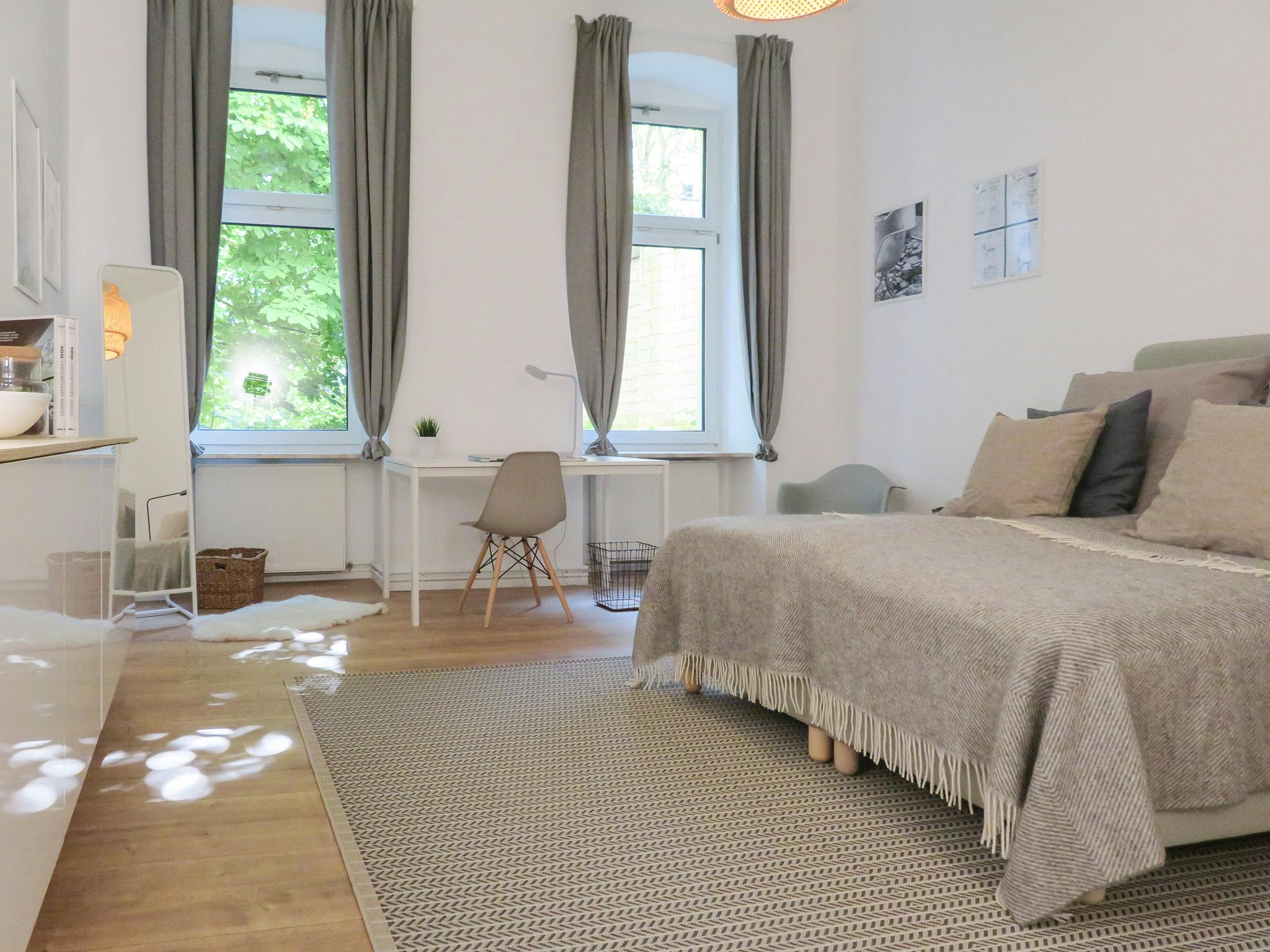 This space is characterized by its neat modern design. It features large window panes that glare natural light into the space, stylish decoration, exceptional furniture, a bathroom with a walking shower a fully equipped kitchen to cook comfortably, creating a beautiful housing space! The two rooms are equipped with a comfortable double bed ensuring a great night of sleep, a large closet providing plenty of room for your clothes, a desk perfect for studying or reading in peace, and you can totally make it feel like your personal spot to unwind.