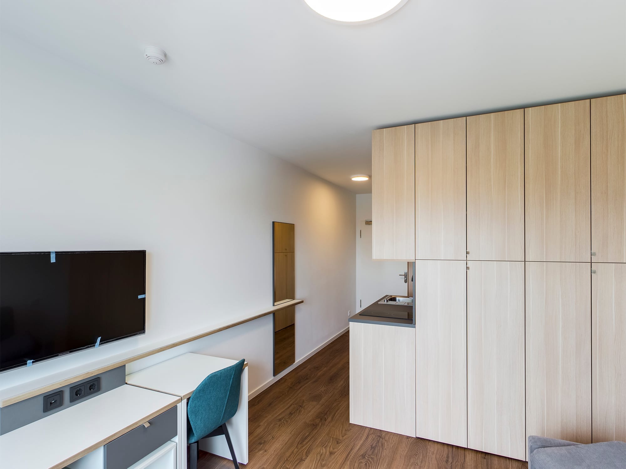 The studios are equipped to a high standard: from a timeless kitchenette with stove, refrigerator and built-in microwave to modern bathrooms with spacious walk-in showers.