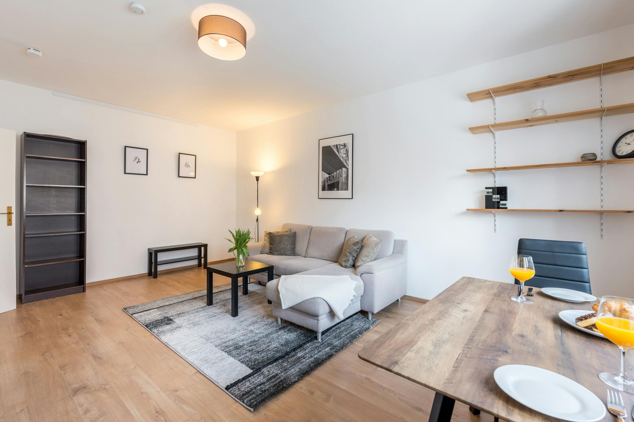 This cute two room apartment offers enough space for up to two tenants. In the living room you will find a comfortable sofa, a large smart tv and a dining table with two chairs. The kitchen has all the essential equipment: an oven, a stove, a toaster, a kettle, a coffee machine, and cookware like pots and pans, plates, mugs, glasses and cutlery. There is a queen sized bed (140×200) in the bedroom. Here you will also find a dresser and some wardrobe rods to hang your clothes. In the bathroom you’ll find a small bathtub that can be used as a shower.
