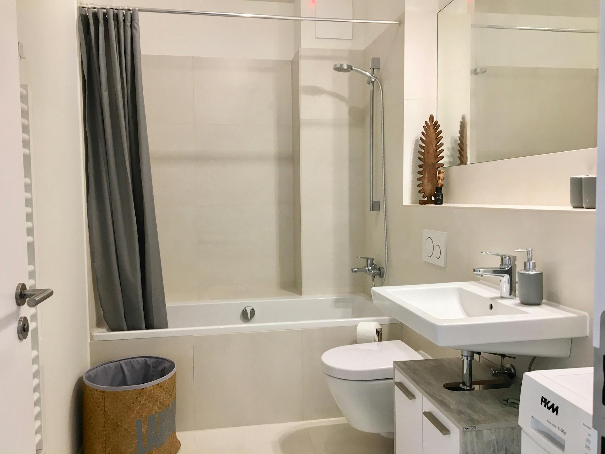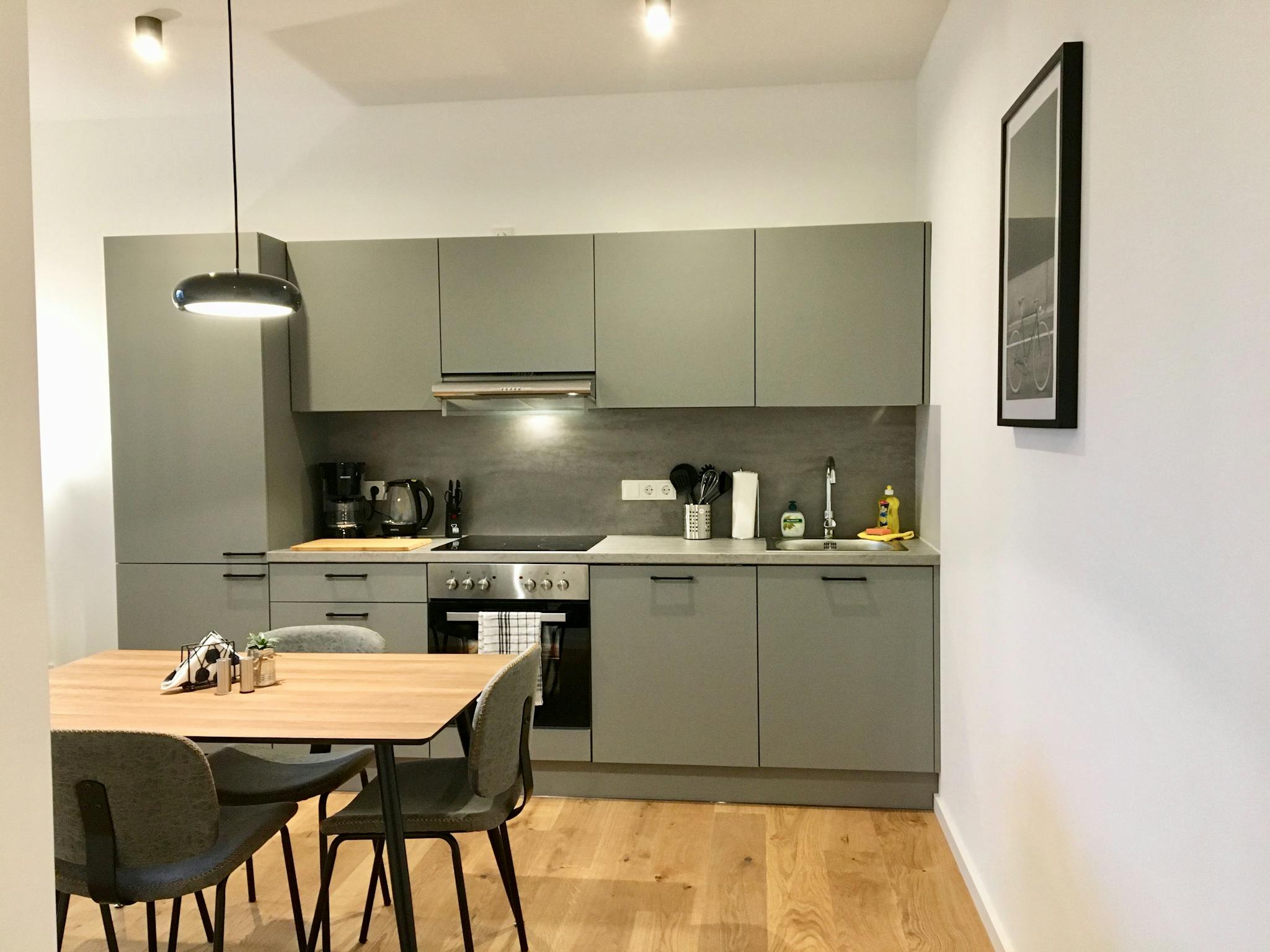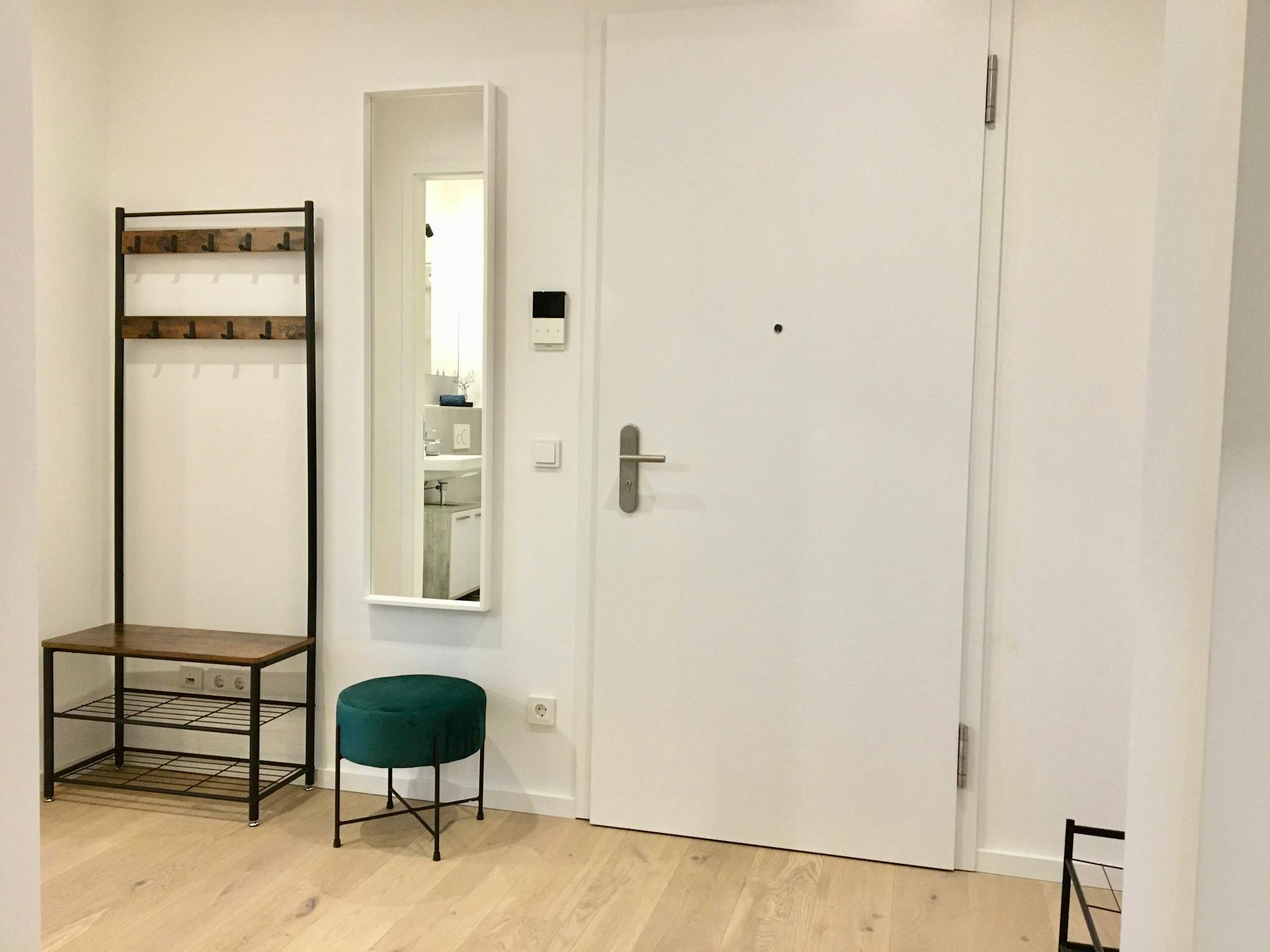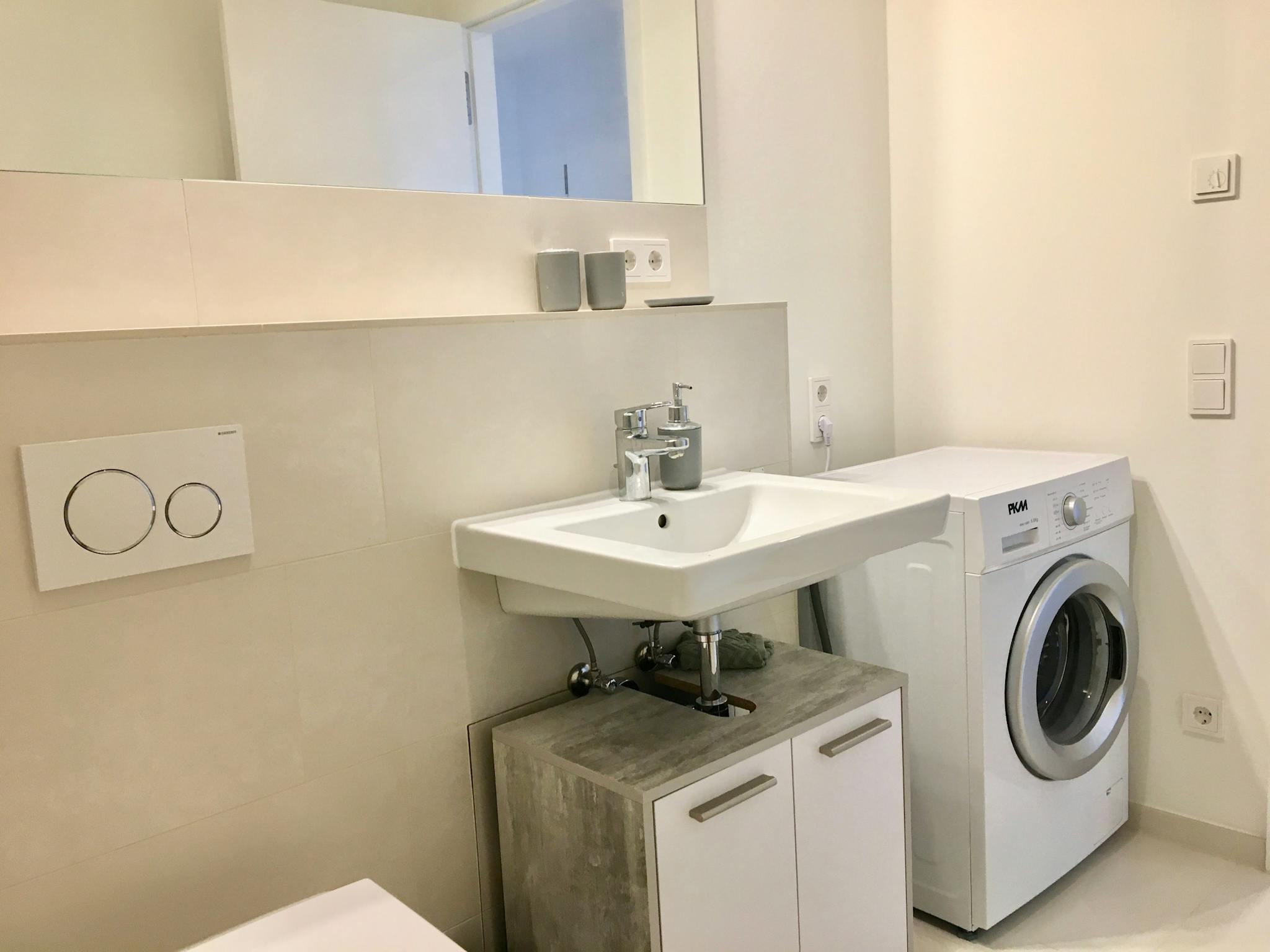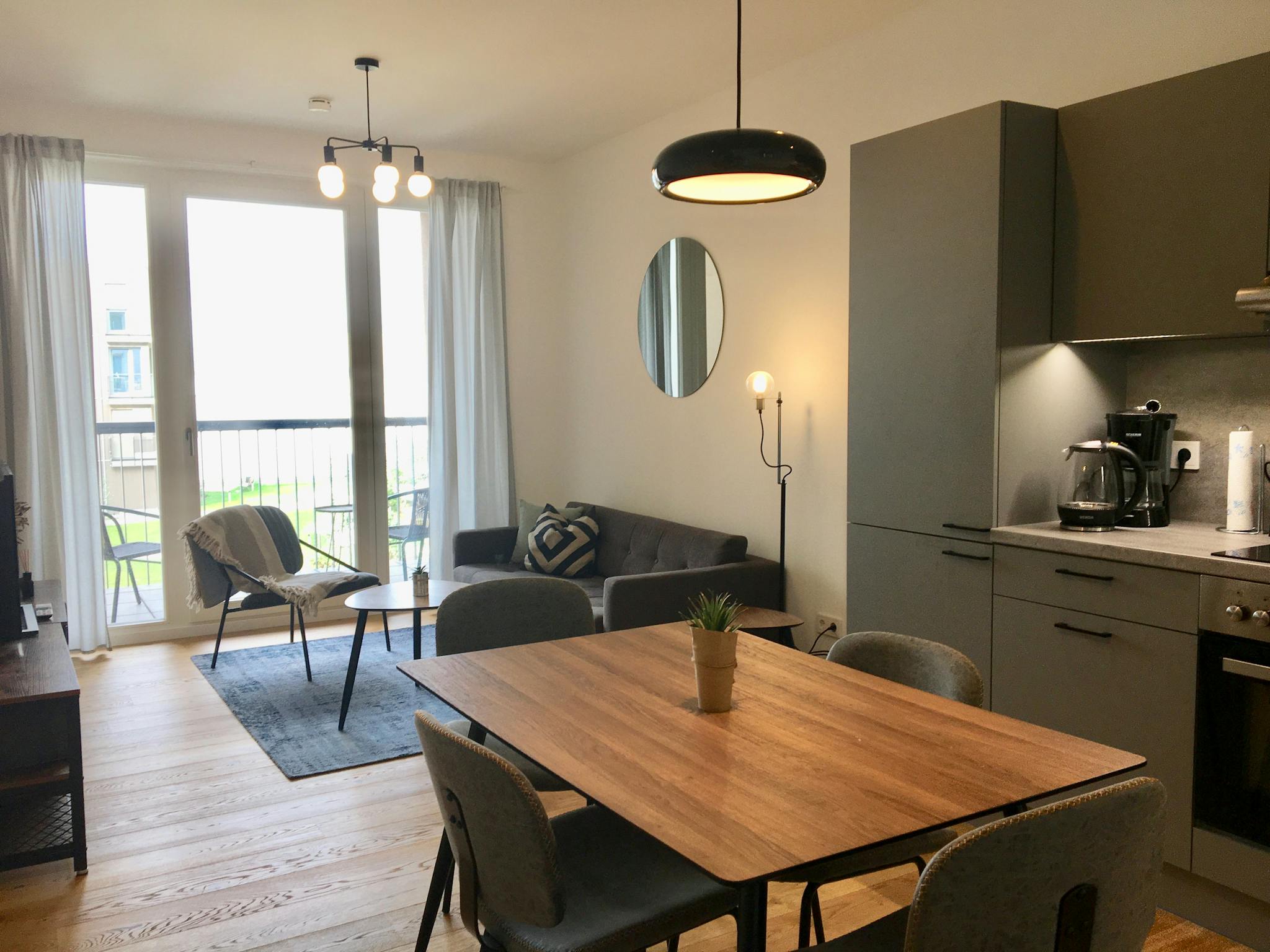 This apartment has a living room/kitchen with a balcony on the west side in the quiet inner courtyard, one bedroom and a bathroom. It is modern, of high quality and comfortably furnished with oak parquet/oak floorboards and floor-to-ceiling sun and heat protection glass windows. The kitchen is furnished with high-quality Siemens/Bosch appliances, induction hob and stainless steel fittings. A video intercom system provides comfort and security. Furthermore, it offers a barrier-free lift connection from the underground car park to all floors, cellars as well as pram and bicycle storage rooms, and is ideally suited for singles and couples.