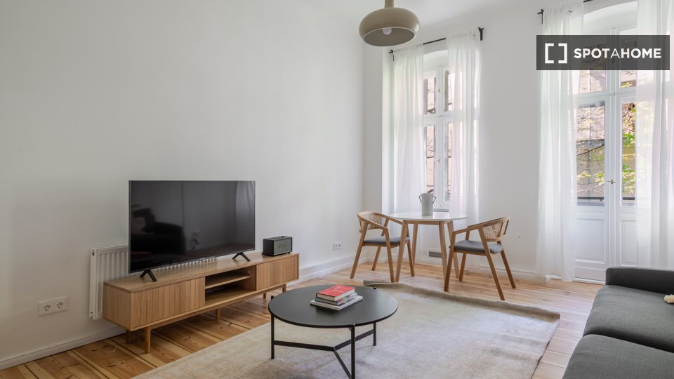 Pets not allowedNot allowedEnjoy this 1-bedroom apartment located in Berlin. The property is fully furnished, offering a kitchen with modern appliances including an oven and a dishwasher, as well as a central heating system for your comfort. A TV is also available for entertainment. The apartment features a lovely balcony or terrace where you can relax. Wi-Fi, water, electricity, and gas are included in this rental.