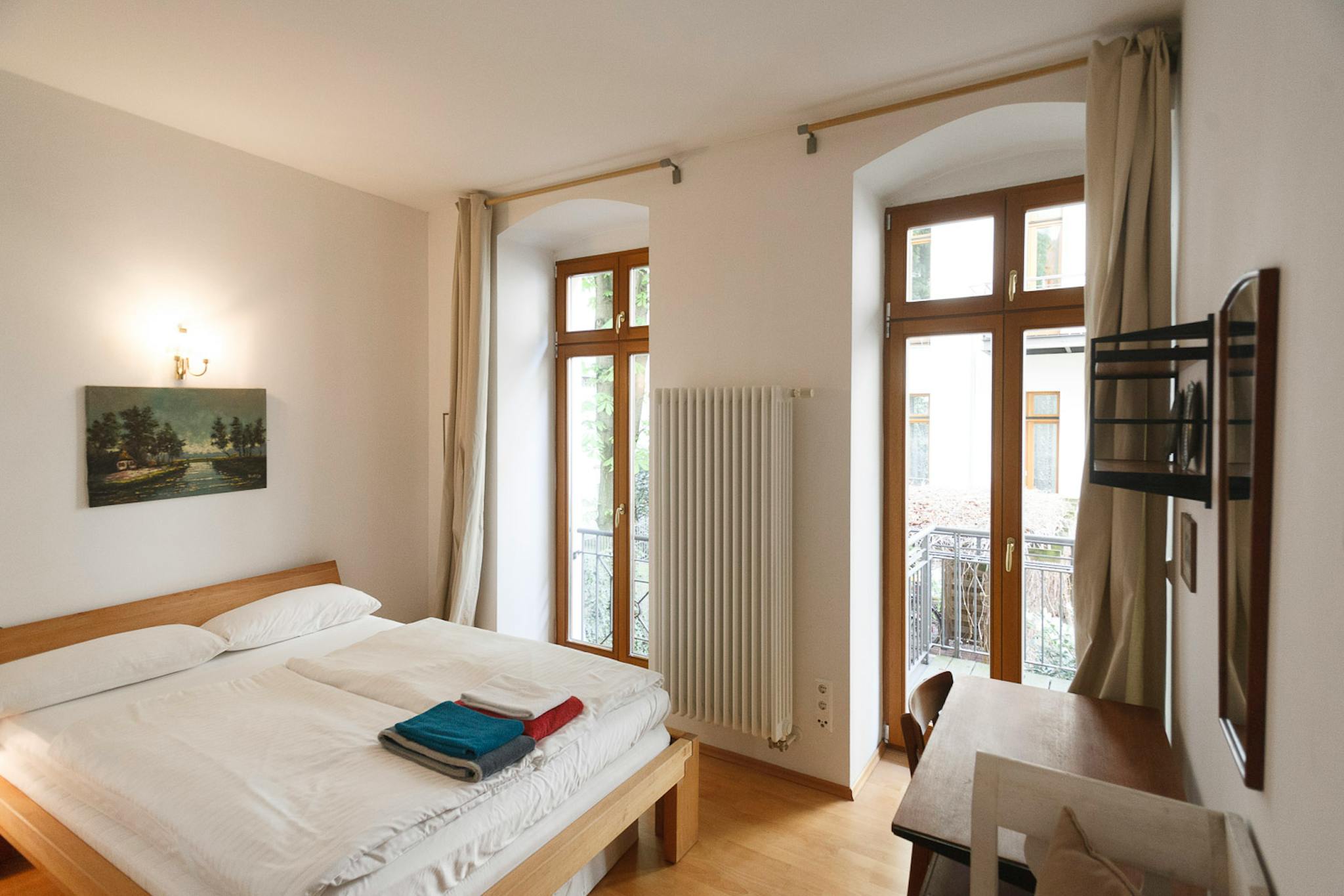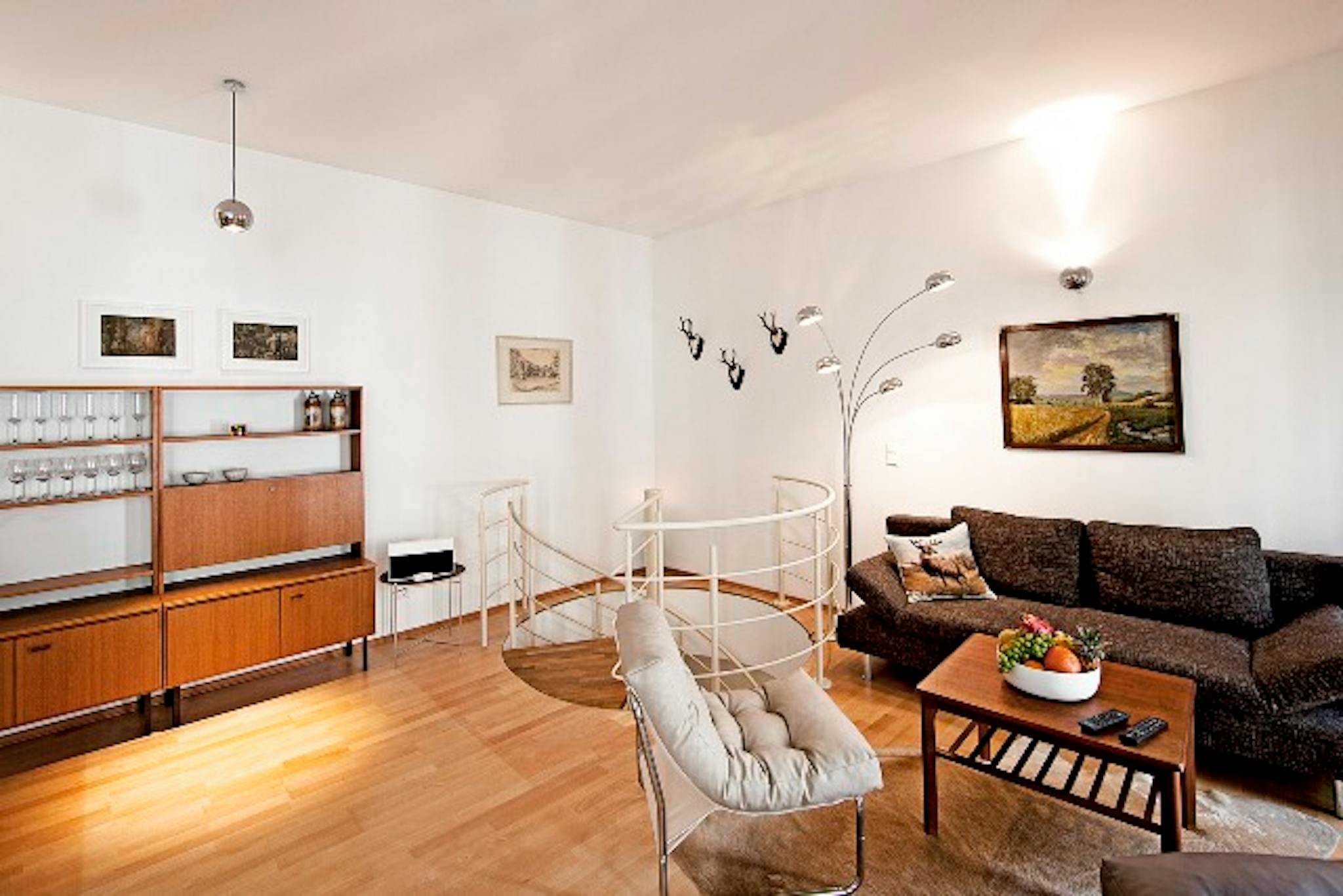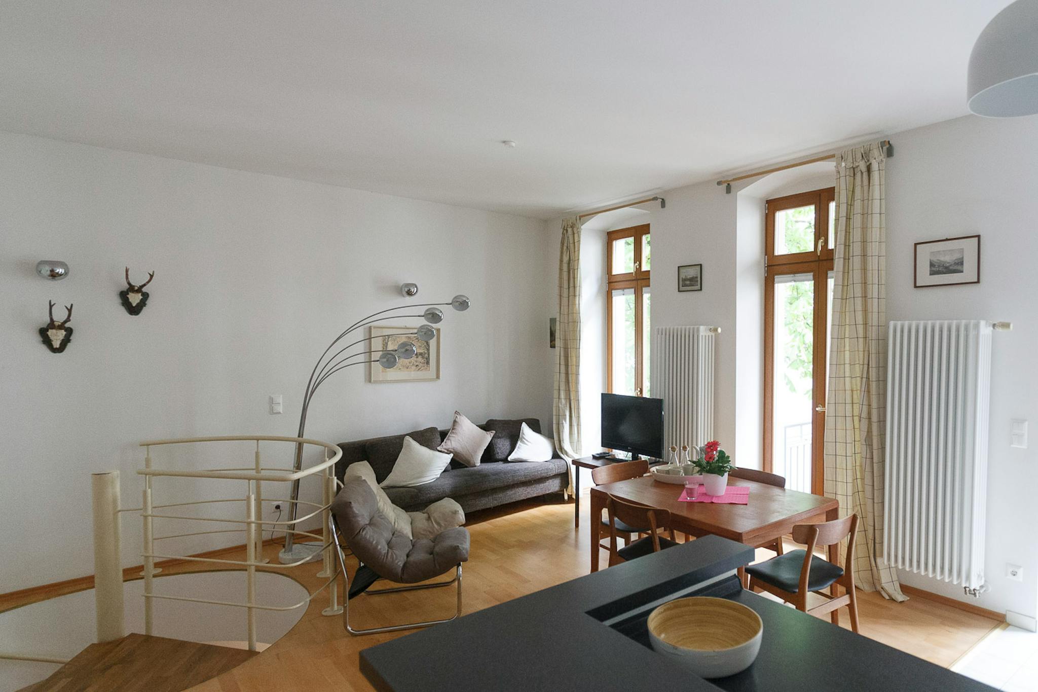 This 3 bedroom apartment offers plenty of space spread over the 1st and 2nd floor. Upstairs is the open kitchen with a breakfast counter and living room. The kitchen is fully equipped. From here you can also access the balcony, which faces the quiet courtyard. The living area offers, in a mix of modern and Danish design, a cosy sitting area. Antlers of self-hunted game adorn the walls to the spiral staircase, which may also be removed by designated vegans. A spiral staircase leads to the lower rooms. Here is the bedroom and another children's or guest room with a pull-out day bed. A modern tub bathroom adjoins here. Another shower room also serves the upper floor. Both floors have a separate entrance.