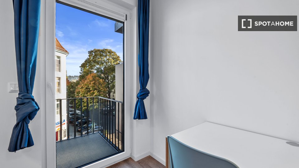 Shower, Mirror, Single bed (90x200), Wardrobe, Wardrobe, Cutlery, Pans & kitchen accessories, Fitted kitchen, Refrigerator, Microwave, Dining Table, Working desk, Vacuum Cleaner, Chairs