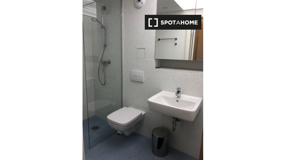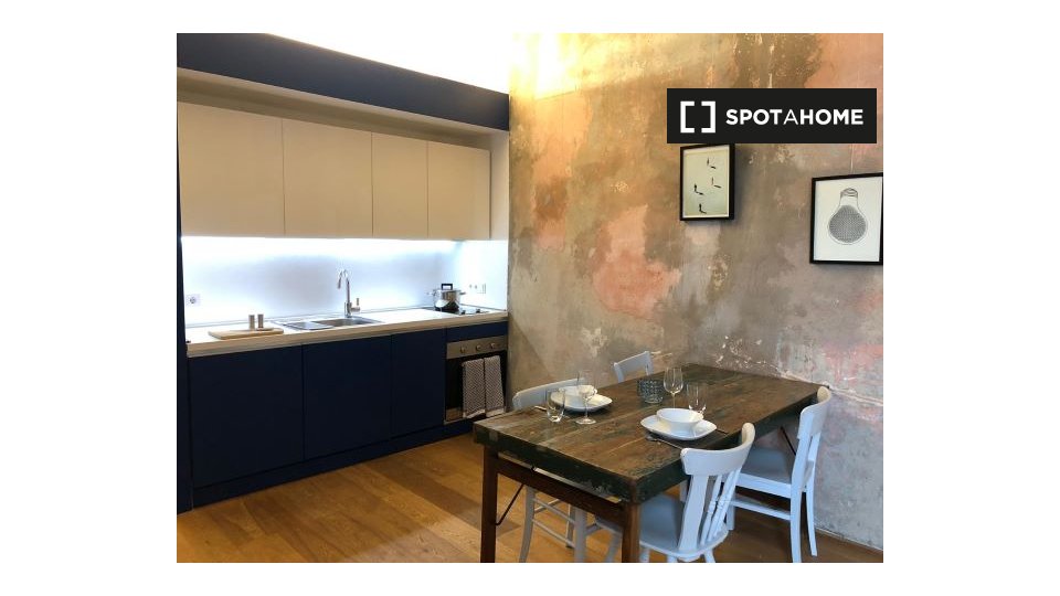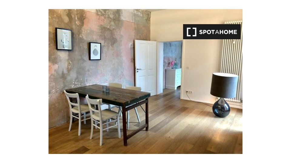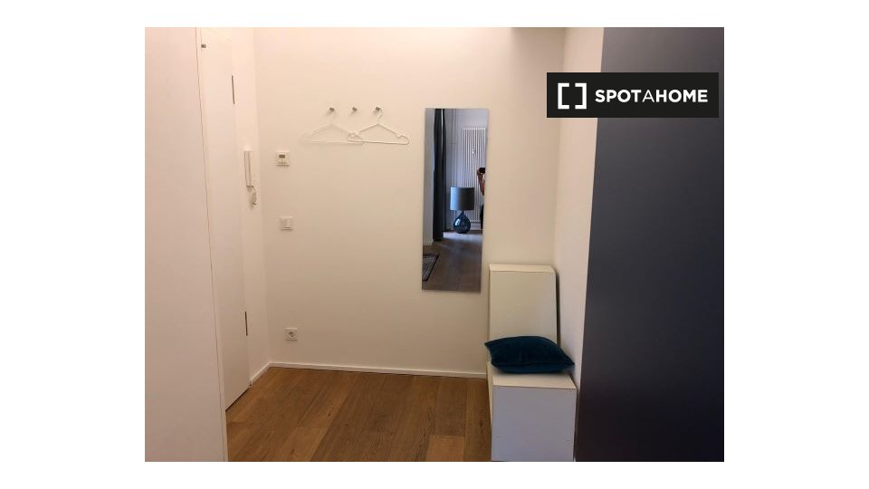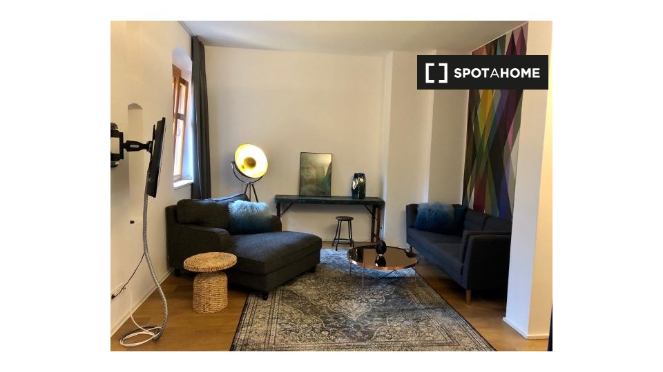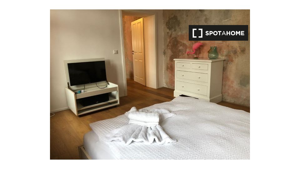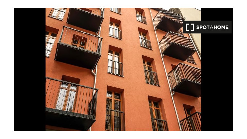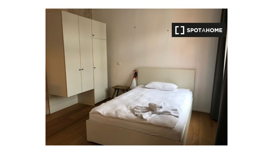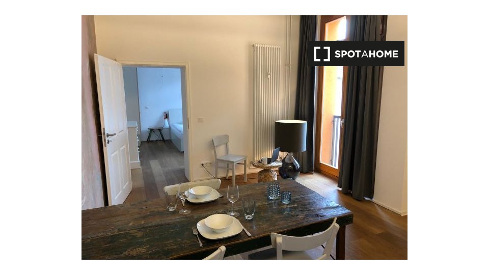 Pets not allowedNot allowedThis 1-bedroom, 1-bathroom apartment available to rent in Friedrichshain has a floor area of 58 m². There is a very sleek and contemporary kitchen / living area with a full-length window, and a rather luxurious bathroom. The bedroom has dark wood flooring and a double bed.