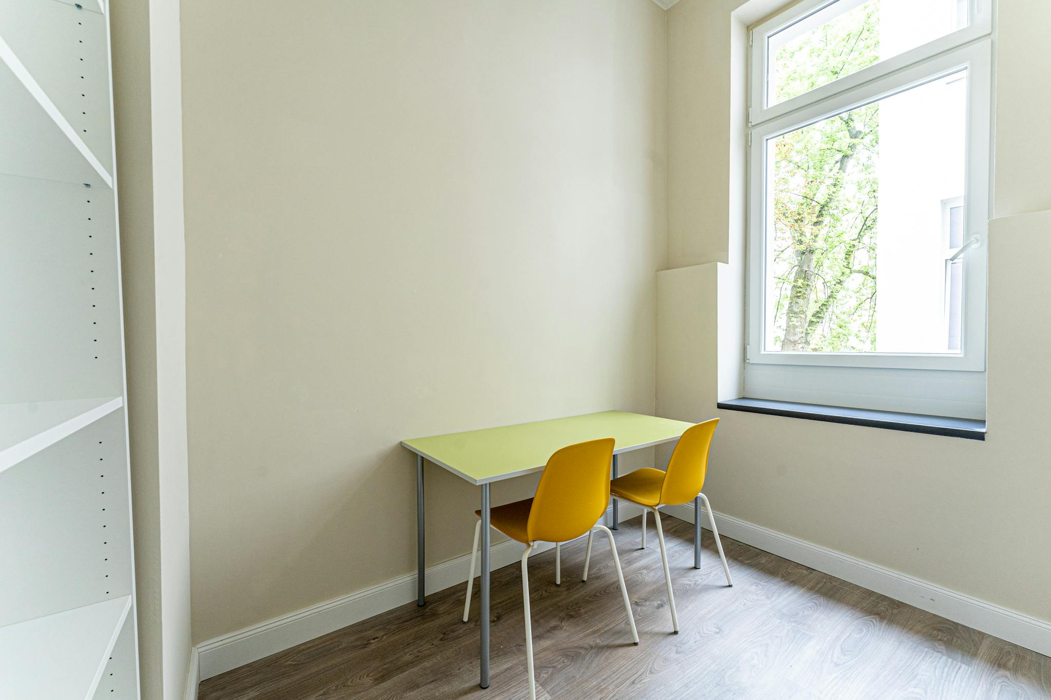 This bright apartment is fully furnished with a bed, desk, chairs, wardrobes, floor lamp and curtains and has large windows.