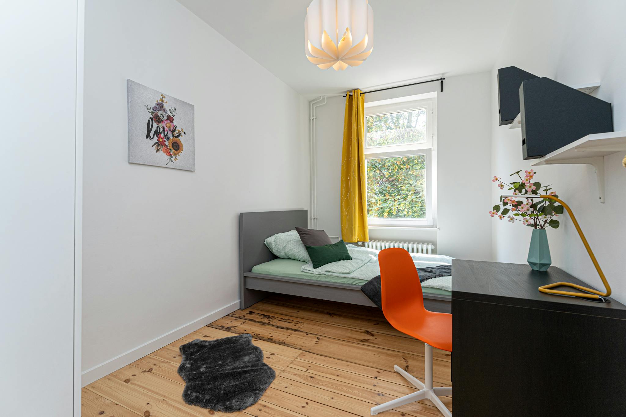 We’re excited to offer a bright and fully furnished room (Room 1) in a shared apartment on the fourth floor. The room is equipped with a comfortable bed, desk, chair, and wardrobe – ideal for studying, working, or simply relaxing.