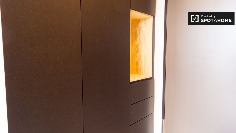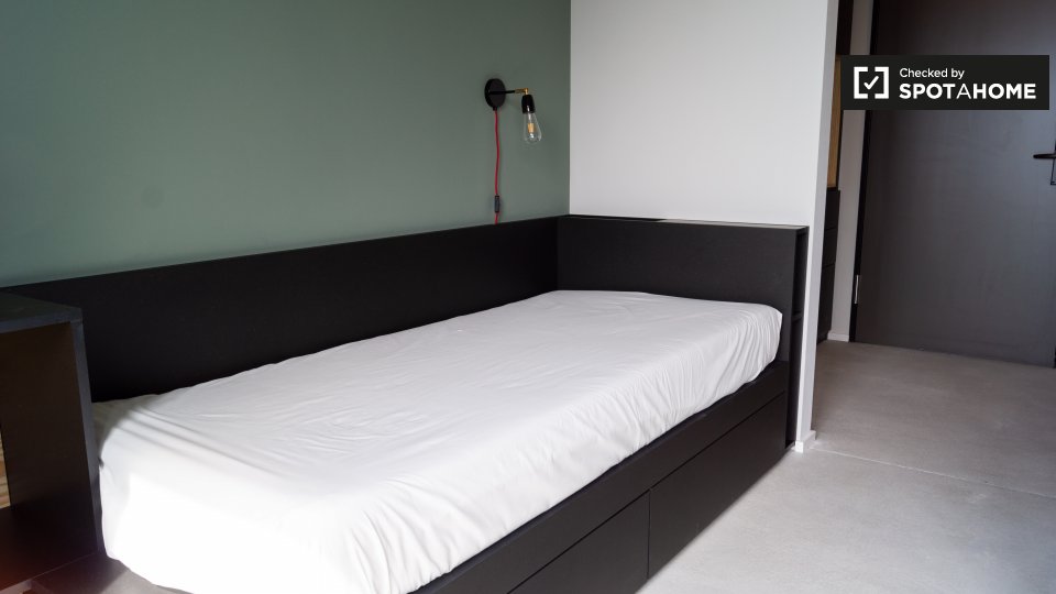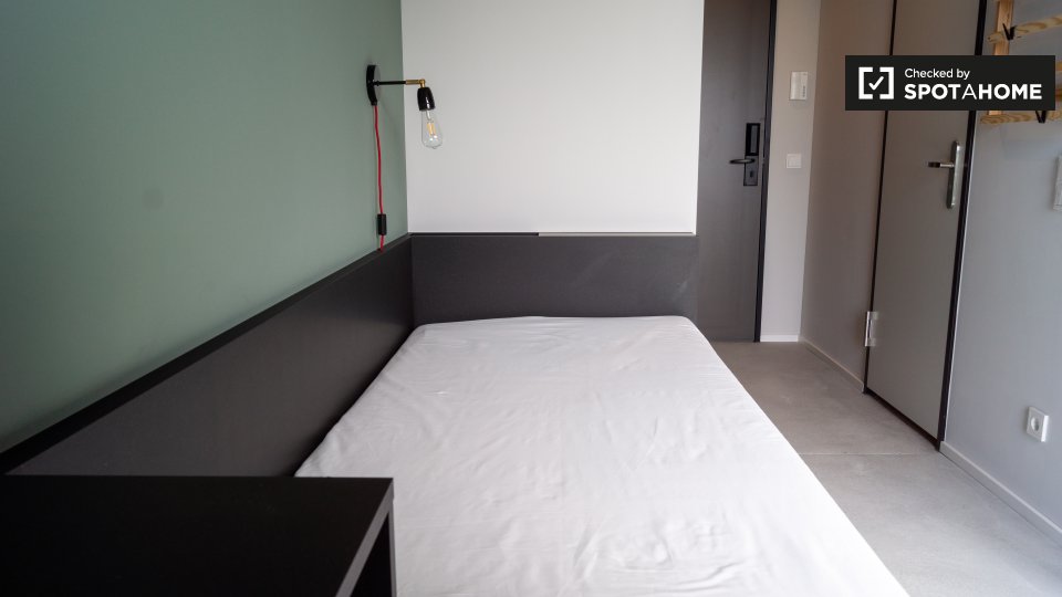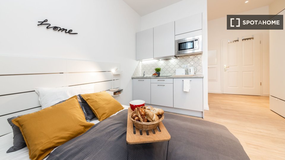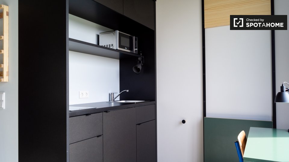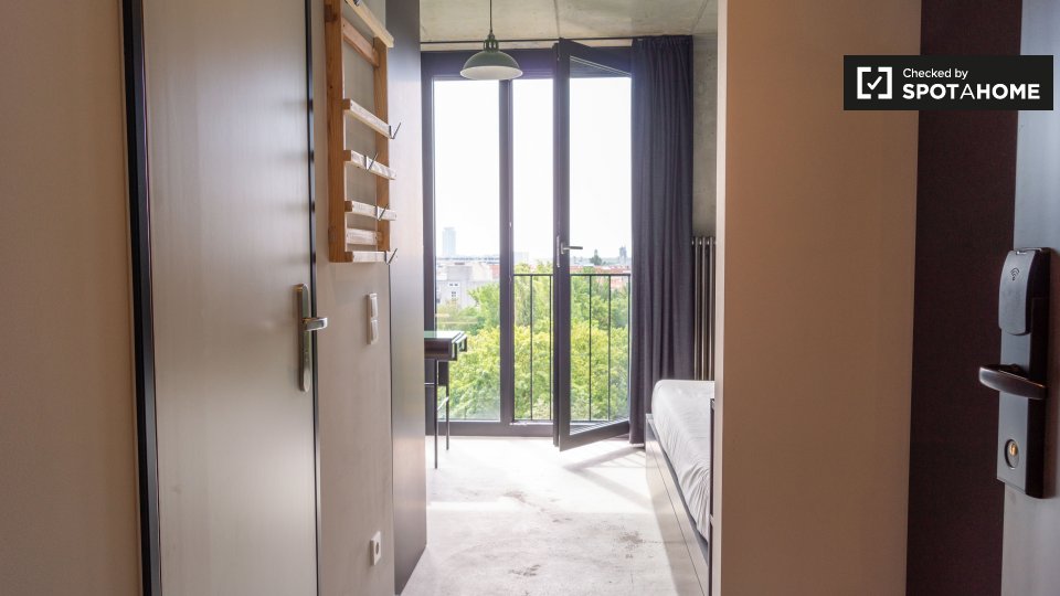**The small and simple studio in Mitte** _Because you're a student, and you want to live in a private studio with all the social benefits of a cool urban-living space – in one of Berlin’s most central neighbourhoods._ **What's so cool about coliving?...** Coliving is a new concept in renting. Rather than live alone, you rent in a building with like-minded peers. It’s a bit like living in a student hall of residence because you share social spaces with your peers. But unlike a hall of residence, coliving spaces work to create happy individuals and healthy communities. Living here, you’ll get to meet people from all over the world. People with different stories, original perspectives, and shared values. You'll make friends, learn surprising lessons, and love the experience. Plus you get everything you need in one place: - Community lobby with games consoles, pool, ping-pong, and air hockey - Gaming room with consoles and a giant screen - Study rooms and silent spaces - Laundry lounge with couches and vending machines selling snacks and drinks - Tranquil gardens and other outside spaces - Community manager on-site to help you every day from 9 am to midnight **Anything else?...** - High-speed Wi-Fi up to 1 Gigabyte/s - Free bike-storage in the courtyard and basement - Pay-as-you-go services: - Parking (optional): €80 per month - Apartment cleaning - Printing - IP-TV service **Tell me more about the studio for rent...** The studio is 17 m², big enough for an organized someone seeking a private space to come home to after a long day with friends. You get custom-designed furniture, including a comfy bed (with storage space underneath), a wardrobe, desk, and a fold-down dining table. The kitchenette isn’t equipped, but it does have a fridge, stove and microwave. The floor-to-ceiling windows make the room feel more spacious than it really is. Even better, they are insulated, so things stay nice and peaceful, which means you get a good night’s sleep.