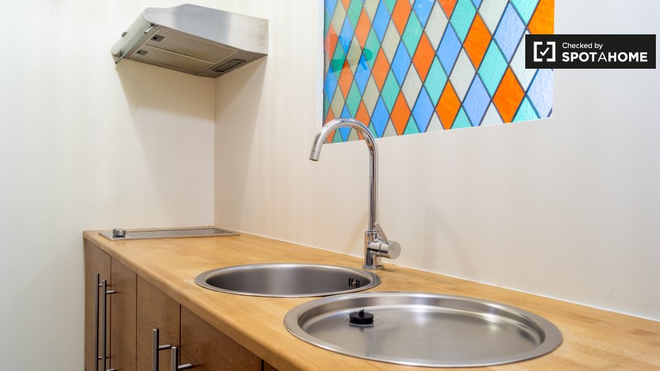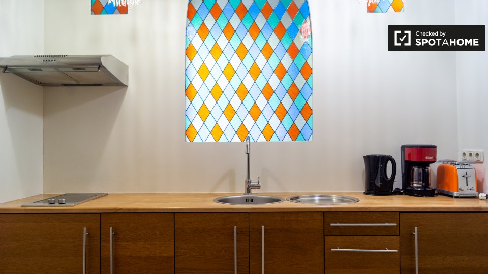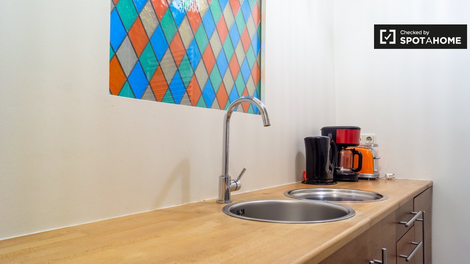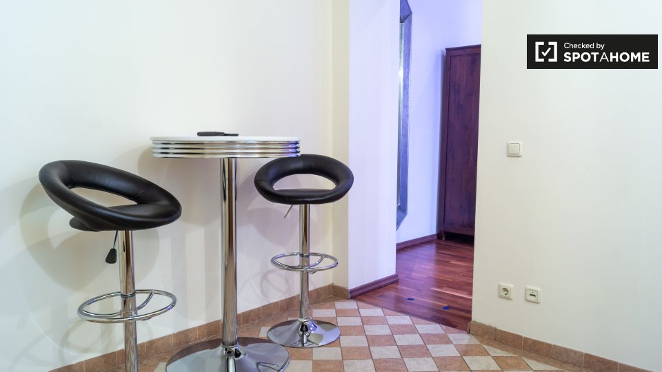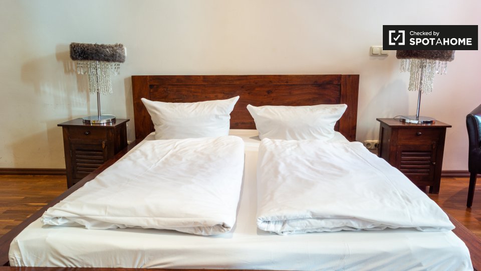 Pets not allowedNot allowedThis modern studio apartment in Schöneberg feels like an upscale hotel room. It does have an equipped kitchen. You’ll have to do your own cooking. But it’s a modern space with a double bed, a bar table with cools stools, wood flooring, and two sunny windows.