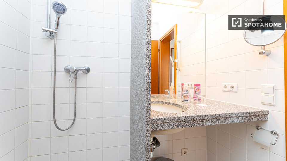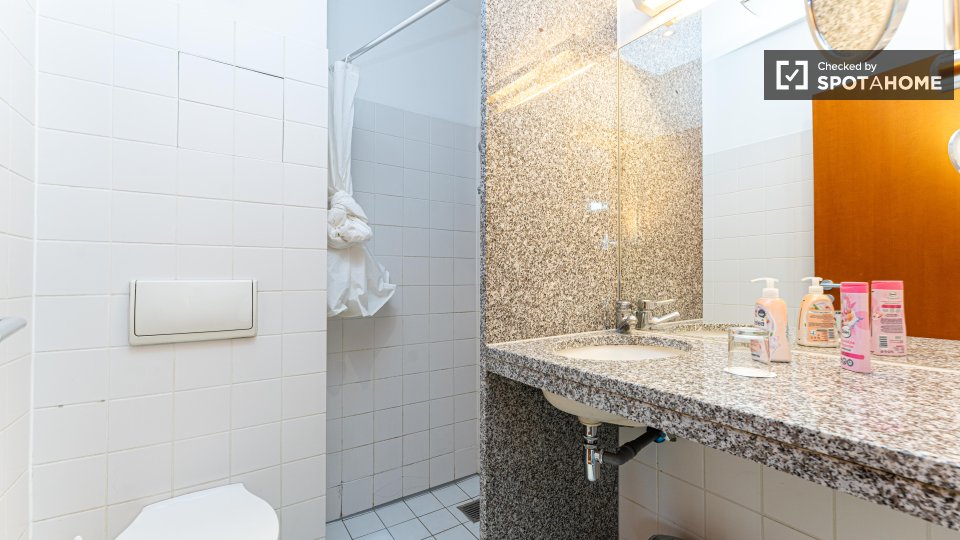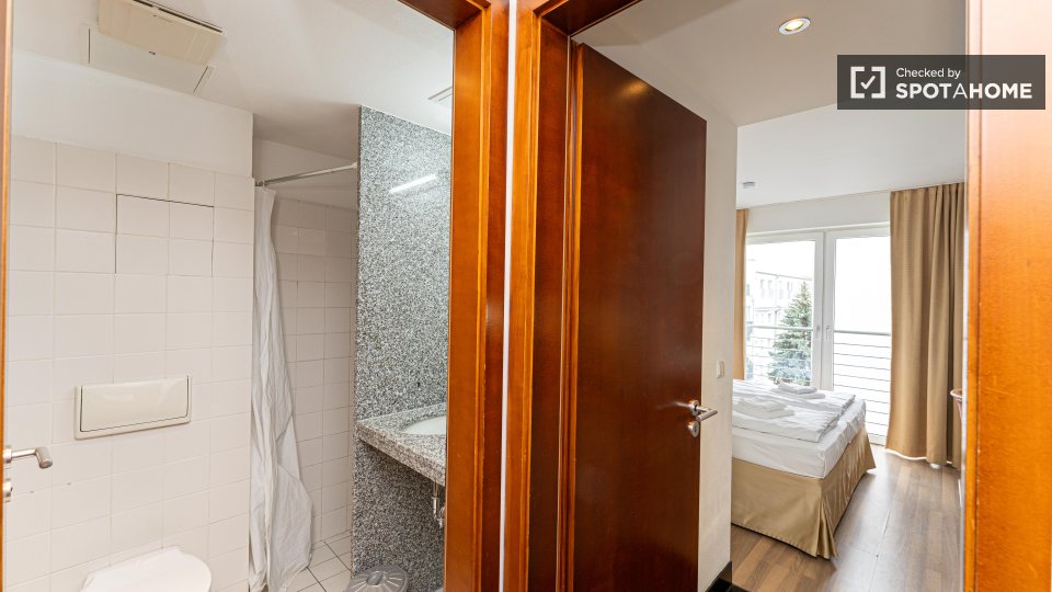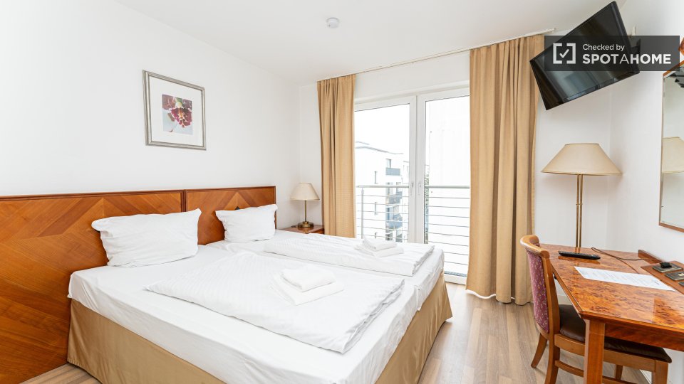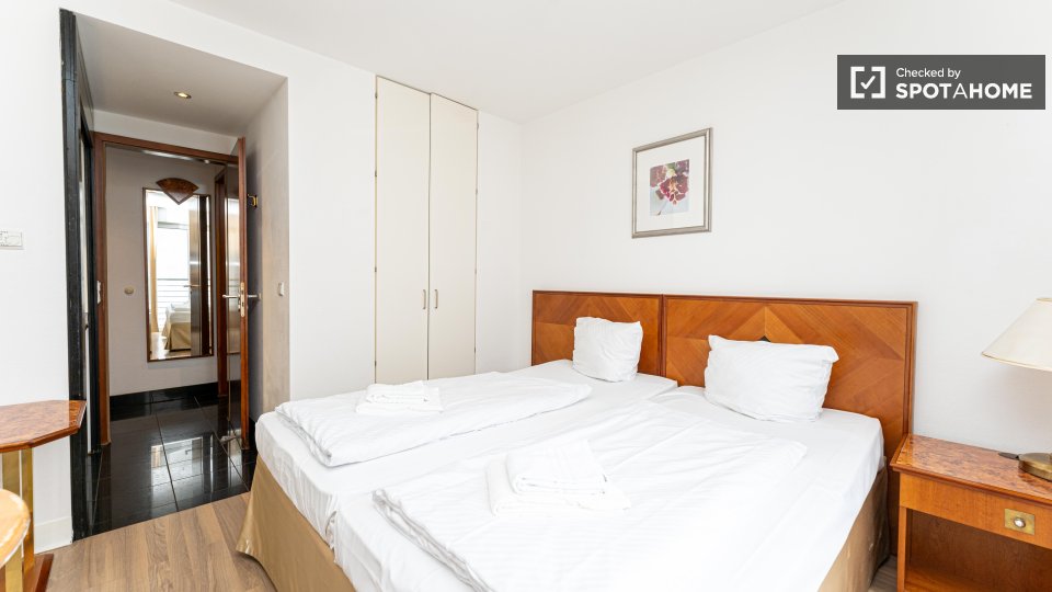 The Apartment has a modern heating system embedded under the wooden parquet floor. Moreover, the apartment is equipped with beside tables, an office desk with chair, an armchair and a TV and has a free high-quality internet Wi-fi. The tenants could store their things well and feel free to use the built-in wardrobes of the apartment and get the home feeling.