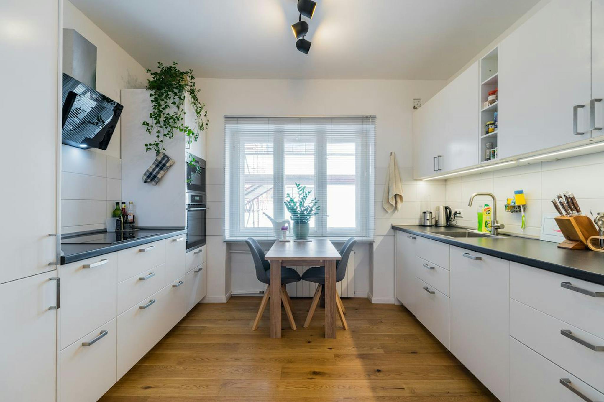 Kitchen: beautiful open space, fully equipped with high-end built-in AEG Electrolux appliances (including an induction hob, fan oven with steam function, microwave, washing machine, dishwasher and pull out tap in a large sink). Coupled with a sturdy pull-out dining table, the kitchen is perfect for quick meals or eloquent dinner parties.